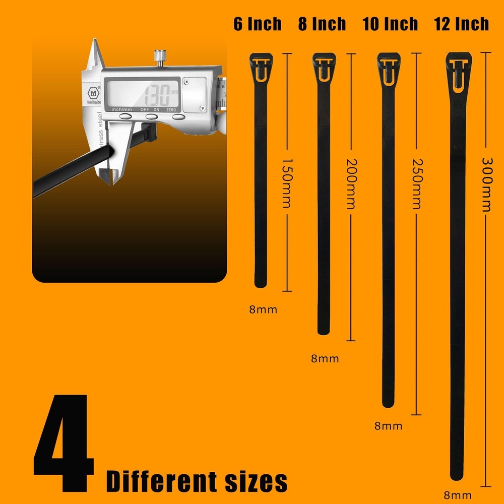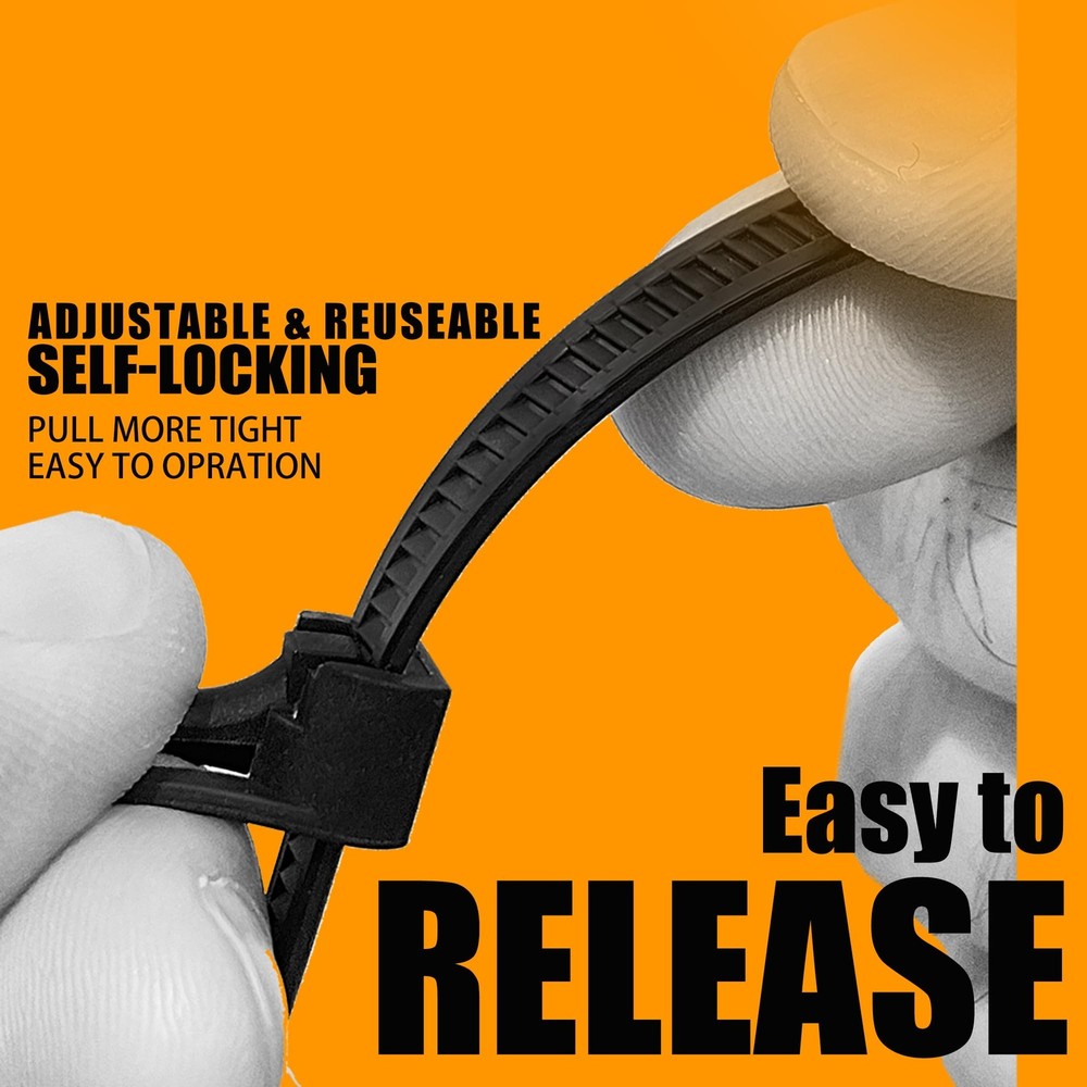 Multi-Purpose Pack: Get ready to tackle all your organizing needs with our versatile pack of 200 plastic nylon ties in 4 different sizes (50 pcs each). From tying cables to fastening tubes and hoses, our family combo pack is well for multi-purpose use. Multi-Purpose Pack: Get ready to tackle all your organizing needs with our versatile pack of 200 pcs plastic nylon zip ties in 4 different sizes (50 pcs each). From tying cables to fastening tubes and hoses, our family combo pack is perfect for multi-purpose use. At , we take pride in using only NEW materials for our nylon zip ties products, unlike others who use recycled materials. Our nylon cable zip ties are durable, strong, and long-lasting, ensuring your items stay securely tied. Releasable & Reusable & Adjustable: Our zip ties are not just strong and durable, they are also adjustable, reusable, and releasable, making them very well for organizing cables and other items that may need to be re-tied or released. Say goodbye to wastage and hello to practicality. Strong & Fire-Resistant: Made with nylon 66, our thick cable zip ties have a tensile strength of 120 lbs., making them strong enough for both indoor and outdoor use. Additionally, they are fire-resistant and can withstand temperatures up to 195°F without drying out or breaking. Wide & Easy to Use: With 4 different sizes to choose from, our reusable zip ties are very well for all your organizing needs. Use them to manage cables, organize plants, fasten tubes and hoses, and much more. Our zip ties are easy to use and , making them a perfect addition to your tool kit or hobby case.