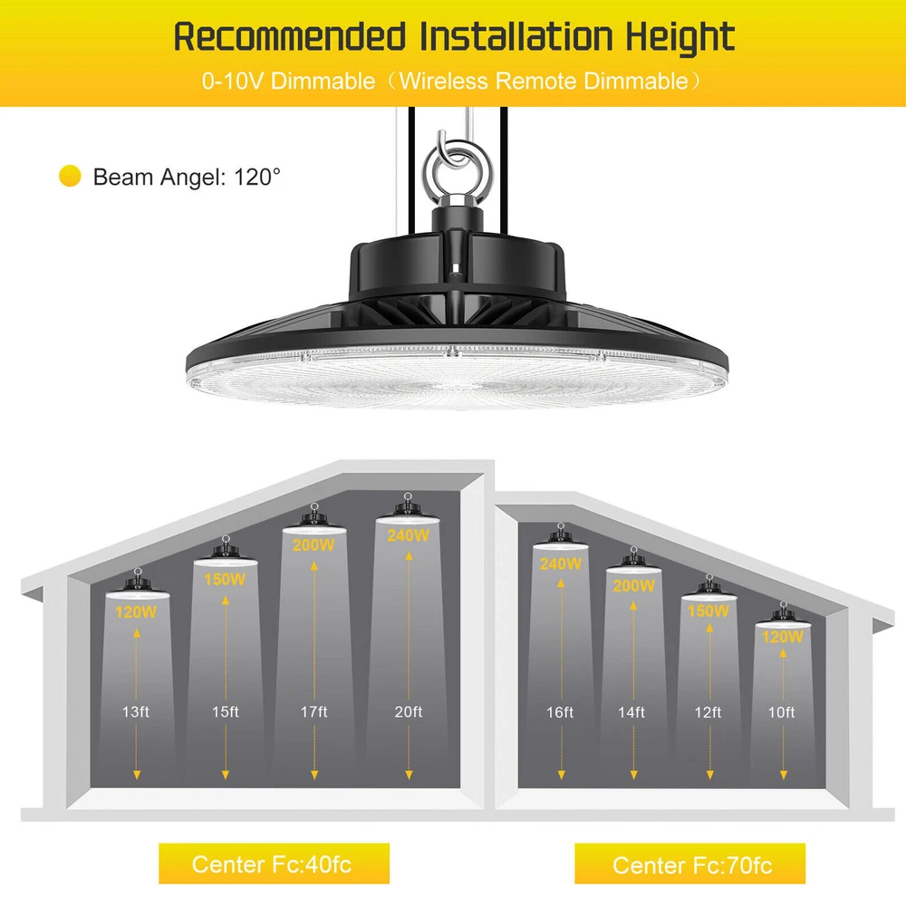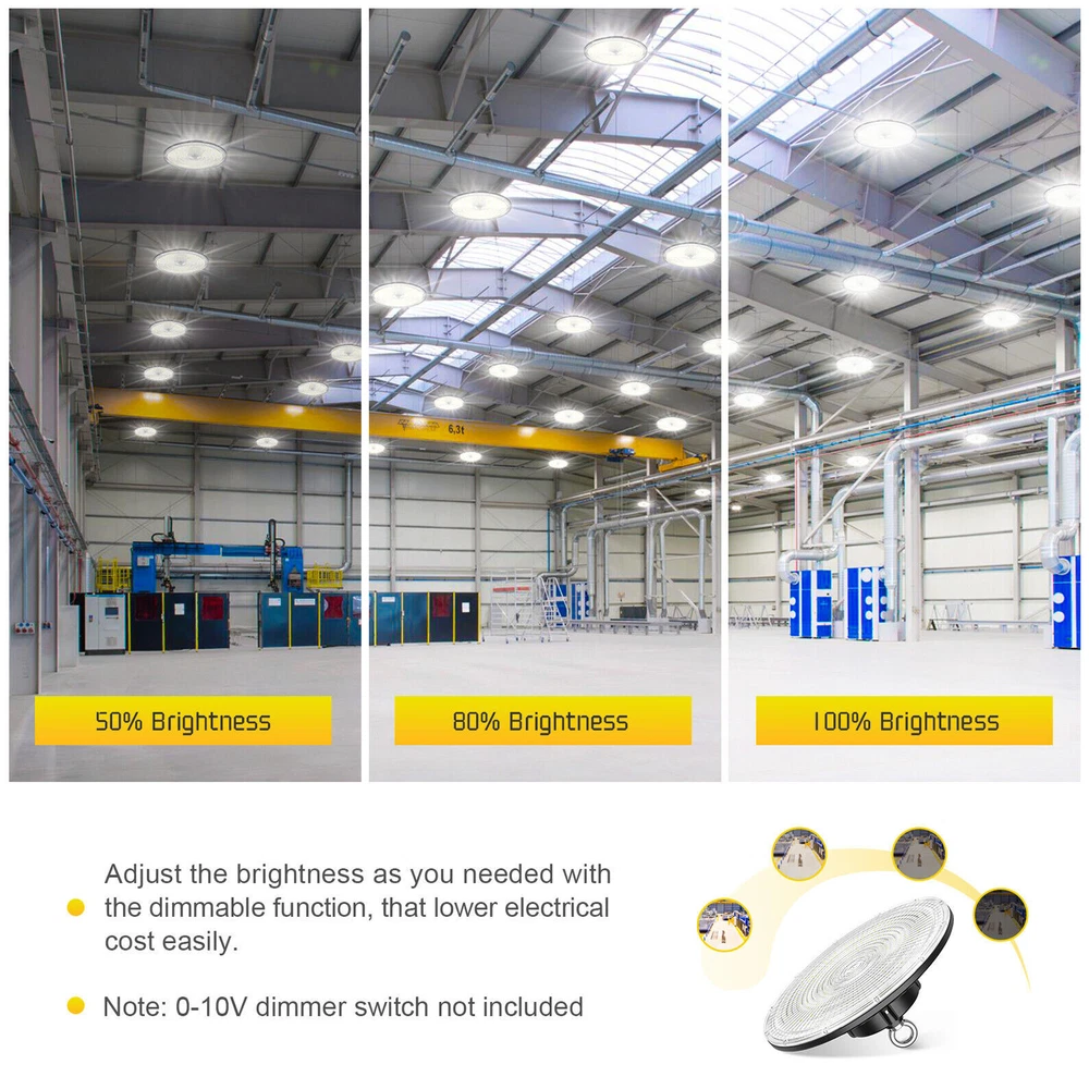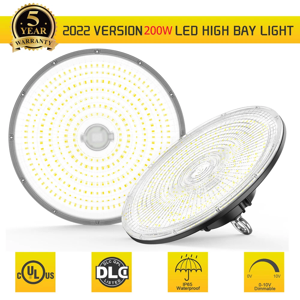 Product Description 200W LED High Bay Light Fixture 5000K Warehouse Garage Workshop 14~22Ft Ceiling 【2022 New Design: Thinner but Larger】Self-design UFO LED high bay light with unique feature of Ultra-thin and border-less design increases luminous area and Φ12.6in improving the heat dissipation of the ufo lights. As the first up & down bay light, the back emission will add the luminous area and light up your ceiling, which will make a total difference of your house with a decorative effect. Fully release your hand and save repairing time when you doing some repairing work around the ceiling. 【Energy&Money Saving】UFO high bay light with 28000 LM (140Lm/W) is a good choice for you to replace 800W HID/HPS, fluorescent and lithonia lights, will help you cut your bill cost down at least 90%. The high bay light has an LED rated life of 50,000 Hours! Over 10 years! Not only will you save on energy but the longer life of LEDs will reduce maintenance costs too. which could be your best commercial light choice! 【Fast&Easy Installation】Have you ever been driven crazy by those complex installation? KUKUPPO is determined to make your installation easy and happy from now on. The package includes a strong hook, a safety cable and 5 foot power cord. Save you time and energy to work on other projects! Please refer to detailed installation steps of instruction. 【Widely Use】IP65 Waterproof for all conditions. You are able to dim this high bay shop light from 0-100% . And it is perfect for both indoor and outdoor use: warehouse, factory, garage, workshop, supermarket, basement, retail space, logistics center, exhibition hall. Better Service: We provide a 5-year warranty for our light. In the next 5 years, we are always ready to stand by you. Please feel free to contact us for any product issue or suggestions. For a bulk order, please send us email in advance to get a lower price Specification Total Power: 200W Power Factor: >90% Input Voltage: AC100-277V 50/60Hz LED Type:SMD3030 LED chips with 130-150Lm/W Luminous Flux(lm): 28000Lm(120W) Color Temperature: 5,000K PFC: >90% Housing Materials: Aluminum Dimmable: 0-10V Dimmable UFO LED High Bay light is the commercial product(2022 version)for indoor warehouse factory or any commercial space with a 12ft ceiling height of ft or more. and with a Correlated Color Temperature (CCT) of 5000K and lumen output 140Lm/w Lumens, this high bay light can get you much brightness than old 400-1,000 Watt HID lights while it would also save you up to 80% of energy on each fixture. The variable maintenance cost gets down to zero owing to its efficiency and performance. It also can be easily hook mounted on any surface. Full screen-largest luminious area Full screen promises the maximum luminous area of UFO bay light. While old versions must leave some area for dissipation, which is not able to fully realize its efficiency. Perfect heat dissipation Compared with old versions, our high bay lights increase 18.75% in diameter, its dissipation area increases accordingly, so it gets better dissipation than others and its life spam will be extended. About Us Payment Shipping Returns Contact Us SHENZHEN NUOGUAN TECHNOLOGY CO. LTD founded in 2010. We are high-technology comany specialized in manufacture Commercial and industrial LED light. Advanced production equipment and excellend R&D ability help us to combining service ,production sell together provide top-level products to our customers. 1. Payment is expected within 7 days of auction close. Or Unpaid Items will be forfeited per eBay . 2. Taxes may be applicable at checkout as states adopt new laws and regulations regarding sales tax collection. 1. We ONLY ship to USA . 2. Orders processed within 1-2 business day of payment verification. There’s no Delivery service or courier service on Saturdays, Sundays or Public Holidays. 3. We have 3 different warehouse in US,so due to stock status and time differences, we will choose to ship your item from our first available warehouse for fast delivery. 4. We offer Free Shipping within the Lower 48 states! All packages are sent via UPS or USPS.The delivery time for UPS Ground is typically 2-5 business days. We strive to ensure 100% satisfaction for each and every one of our customers. we offer a 30-day 100% money-back guarantee on all eBay orders. If your item isn't just as you wished, simply send it back to us and we'll refund or replace your item. Please note that all returns must be authorized by our Customer Service department. please contact us though message first if you have any problem. USA Warehouse. Fast shipping! We are appreciated your purchasing form our eBay store. Office Time: 9:30 - 18:30, Monday - Saturday (UTC+8) Please contact us with eBay Message. We will respond you within 24 hours on business day. About Us SHENZHEN NUOGUAN TECHNOLOGY CO. LTD founded in 2010. We are high-technology comany specialized in manufacture Commercial and industrial LED light. Advanced production equipment and excellend R&D ability help us to combining service ,production sell together provide top-level products to our customers. Payment 1. Payment is expected within 7 days of auction close. Or Unpaid Items will be forfeited per eBay . 2. Taxes may be applicable at checkout as states adopt new laws and regulations regarding sales tax collection. Shipping 1. We ONLY ship to USA . 2. Orders processed within 1-2 business day of payment verification. There’s no Delivery service or courier service on Saturdays, Sundays or Public Holidays. 3. We have 3 different warehouse in US,so due to stock status and time differences, we will choose to ship your item from our first available warehouse for fast delivery. 4. We offer Free Shipping within the Lower 48 states! All packages are sent via UPS or USPS.The delivery time for UPS Ground is typically 2-5 business days. Returns We strive to ensure 100% satisfaction for each and every one of our customers. we offer a 30-day 100% money-back gu