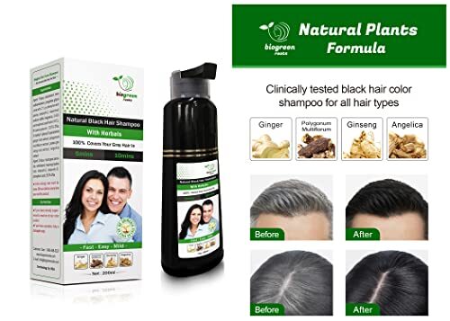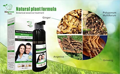 200 ml Natural Black Hair Color Shampoo With Herbals is manufactured with pure and real botanical ingredients, minerals, and purified water. No use of ammonia makes it a stain-free, natural-color shampoo for the skin. The natural ingredients used in our hair dye shampoo are ginger, ginseng, polygonum multiflorum, and angelica. This gives this color-dye shampoo the ability to strengthen, repair, nourish, and protect your scalp against dryness and gray hair. This shampoo is not for daily use. Use 3–4 weeks after the last application to cover your gray hair in an instant. Instructions to use: 1- Remove the cap and the cover. 2- Wear the gloves. 3- Pour the Natural Black biogreen coloring shampoo and mix it well on your hands. 4- Apply on your dry hair and wait for 10 minutes. 5- Wash your hair thoroughly. 6- Get the beautiful result of this clarifying shampoo and enjoy the lustrous, shiny hair of your younger days. Do not use: 1- If you have already experienced a reaction to hair color products. 2- If you have a sensitive, itchy, and damaged scalp. NATURAL BLACK HAIR SHAMPOO: Our Natural Black Hair Shampoo is a luxurious and gentle way to bring out the best in your hair, thanks to its blend of nutritive botanicals and herbs that are carefully selected to nourish and strengthen your hair from root to tip. Our Herbal Coloring Shampoo is infused with real Ginger, Polygonum Multiflorum, Angelica, and Ginseng, which can help reverse gray hair. IMPROVE AND ENHANCE HAIR HEALTH: Our hair dye shampoo is designed to do more than just enhance the color of your hair - it's crafted to also improve its overall health. With its hydrating formula, it helps combat dryness and promotes a healthy scalp for shinier, thicker, fuller, and more radiant-looking hair. GREAT SCENT EXPERIENCE: The pleasant scent of our hair dye shampoo is long-lasting and invigorating, leaving your hair smelling fresh and revitalized throughout the day. Our use of real botanical ingredients in our shampoo means that you can enjoy the benefits of aromatherapy as well as beautiful-looking hair. EASY & QUICK TO USE: Shampoo that dyes your hair in minutes. Say hello to salon-quality hair in the comfort of your own home! Our shampoo is easy and quick to use. Simply wear the gloves, pour the clarifying shampoo, apply to dry hair, wait 10 minutes, and rinse for a fresh new look. FOR ALL TYPES OF HAIR: Our hair dye shampoo is suitable for all types of hair, whether it's curly, straight, fine, or thick. Its gentle formula is perfect for men and women who want to change their hair color without damaging their hair.