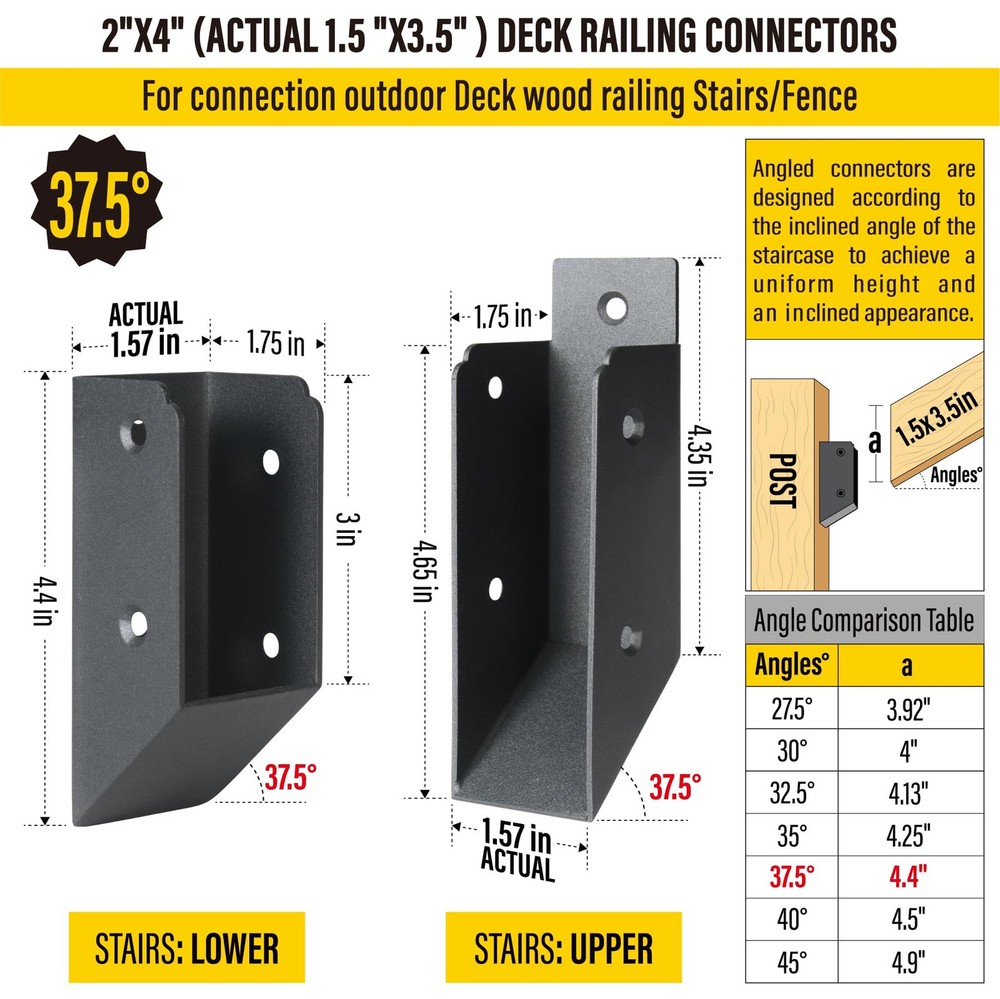 AECXM 201 Stainless Steel 2" x 4" (1 ½" x 3 ½" Actual) Deck Railing 37.5°Stair Connectors, for Deck Railing Stair Handrail Connection Installation Deck Railing Bracket (4 Pair-Black) Material steel STRONG AND DURABLE: Stair Railing 37.5°Stair bracket connectors are made of high-strength and corrosion-resistant 201 stainless steel material, With high-temperature black powder-coating treatment on the surface, Which is waterproof, rustproof, and resistant to wind, rain and high temperature erosion, Deck railing bracket hidden design, indoor and outdoor can choose to use, beautiful and generous SIZE ADAPTATION: The Deck Railing 37.5°Stair Connector is suitable for connecting standard 2" x 4" (Actually 1 ½" x 3 ½") wood components, Suitable for deck railing handrail connection installation SIZE SPECIFICATION: Top: L1.75" x W1.57" x H4.65" Bottom: L1.75" xW 1.57" x H4.4" (Actual mounting size: 1 ½" x 3 ½") Qty: 4pairs (4pack of Top/Bottom) QUICK INSTALLATION: The set includes all Bracket pieces (4 pairs), Screws (L/1.57in/24pcs S/0.78in/32pcs) and 1 Drill bit (Φ1/8"), they can install easy: 1. Lean the bracket into the pre-installed position on the post, drill the pre-set holes and lock in the long screws; 2. Slide the handrail (the ends need to be built and sanded in accordance with the inclination angle of the installation) at both ends into the joists, and then lock in the short screws on each side respectively, and Installation completed MULTIPLE ANGLE USE: Our Deck Railing Bracket Connectors include parallel brackets and stair angle brackets (including 27.5°/30°/32.5°/35°/37.5°/40°/45°), which are designed to match the angle of inclination of the staircase in order to give the balustrade a uniform overall incline and appearance. You can purchase them upon request to make your deck railing easier to build, beautiful and secure If you have any suggestions or questions about our products, please feel free to contact us. AECXM 201 Stainless Steel 2" x 4" (1 ½" x 3 ½" Actual) Deck Railing 37.5°Stair Connectors, for Deck Railing Stair Handrail Connection Installation Deck Railing Bracket (4 Pair-Black) AECXM 201 Stainless Steel 2" x 4" (1 ½" x 3 ½" Actual) Deck Railing 37.5°Stair Connectors, for Deck Railing Stair Handrail Connection Installation Deck Railing Bracket (4 Pair-Black) AECXM 201 Stainless Steel 2" x 4" (1 ½" x 3 ½" Actual) Deck Railing 37.5°Stair Connectors, for Deck Railing Stair Handrail Connection Installation Deck Railing Bracket (4 Pair-Black) AECXM 201 Stainless Steel 2" x 4" (1 ½" x 3 ½" Actual) Deck Railing 37.5°Stair Connectors, for Deck Railing Stair Handrail Connection Installation Deck Railing Bracket (4 Pair-Black) AECXM 201 Stainless Steel 2" x 4" (1 ½" x 3 ½" Actual) Deck Railing 37.5°Stair Connectors, for Deck Railing Stair Handrail Connection Installation Deck Railing Bracket (4 Pair-Black) AECXM 201 Stainless Steel 2" x 4" (1 ½" x 3 ½" Actual) Deck Railing 37.5°Stair Connectors, for Deck Railing Stair Handrail Connection Installation Deck Railing Bracket (4 Pair-Black) AECXM 201 Stainless Steel 2" x 4" (1 ½" x 3 ½" Actual) Deck Railing 37.5°Stair Connectors, for Deck Railing Stair Handrail Connection Installation Deck Railing Bracket (4 Pair-Black) AECXM 201 Stainless Steel 2" x 4" (1 ½" x 3 ½" Actual) Deck Railing 37.5°Stair Connectors, for Deck Railing Stair Handrail Connection Installation Deck Railing Bracket (4 Pair-Black) AECXM 201 Stainless Steel 2" x 4" (1 ½" x 3 ½" Actual) Deck Railing 37.5°Stair Connectors, for Deck Railing Stair Handrail Connection Installation Deck Railing Bracket (4 Pair-Black) AECXM 201 Stainless Steel 2" x 4" (1 ½" x 3 ½" Actual) Deck Railing 37.5°Stair Connectors, for Deck Railing Stair Handrail Connection Installation Deck Railing Bracket (4 Pair-Black) Shipping We offer FREE shipping on all orders! We ship within Three business days of payment, usually sooner. We use a selection of shipping services such as UPS, FedEx, USPS etc. We only ship to the lower 48 states, no APO/FPO addresses or PO Boxes allowed. Local pickups and combined shipping options are not provided at this time. Return You can return a product for up to 30 days from the date you purchased it. Any product you return must be in the same condition you received it and in the original packaging. Please keep the receipt. Payment We accept payment by any of the following methods: Payoneer Please pay as soon as possible after winning an auction, as that will allow us to post your item to you sooner! Feedback Customer satisfaction is very important to us. If you have any problem with your order, please contact us and we will do our best to make you satisfied. Contact Us If you have any queries, please contact us via ebay. We usually respond within 24 hours on weekdays.