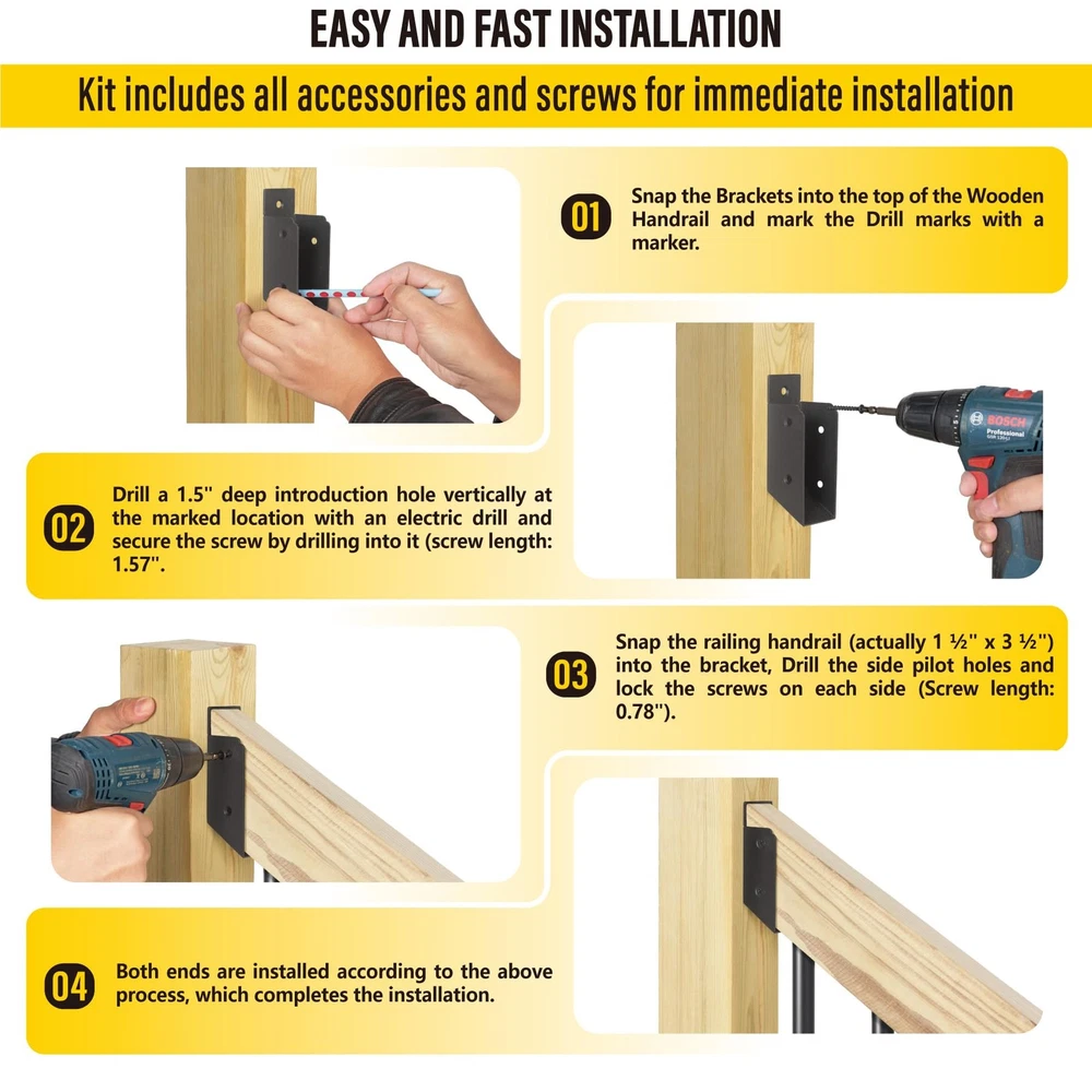 AECXM 201 Stainless Steel 2" x 4" (1 ½" x 3 ½" Actual) Deck Railing 45° Stair Connectors, for Deck Railing Stair Handrail Connection Installation Deck Railing Bracket (4 Pair-Black) Material Stainless Steel Item Depth 5.5 inches Mounting Type Deck Mount Manufacturer Aecxm STRONG AND DURABLE: Stair Railing 45° Stair bracket connectors are made of high-strength and corrosion-resistant 201 stainless steel material, With high-temperature black powder-coating treatment on the surface, Which is waterproof, rustproof, and resistant to wind, rain and high temperature erosion, Deck railing bracket hidden design, indoor and outdoor can choose to use, beautiful and generous SIZE ADAPTATION: The Deck Railing 45° Stair Connector is suitable for connecting standard 2" x 4" (Actually 1 ½" x 3 ½") wood components, Suitable for deck railing handrail connection installation SIZE SPECIFICATION: Top: L1.75" x W1.57" x H5.5" Bottom: L1.75" xW 1.57" x H4.9" (Actual mounting size: 1 ½" x 3 ½") Qty: 4 pairs (4pack of Top/Bottom) QUICK INSTALLATION: The set includes all Bracket pieces (4 pairs), Screws (L/1.57in/24pcs S/0.78in/32pcs) and 1 Drill bit (Φ1/8"), they can install easy: 1. Lean the bracket into the pre-installed position on the post, drill the pre-set holes and lock in the long screws; 2. Slide the handrail (the ends need to be built and sanded in accordance with the inclination angle of the installation) at both ends into the joists, and then lock in the short screws on each side respectively, and Installation completed MULTIPLE ANGLE USE: Our Deck Railing Bracket Connectors include parallel brackets and stair angle brackets (including 27.5°/30°/32.5°/35°/37.5°/40°/45°), which are designed to match the angle of inclination of the staircase in order to give the balustrade a uniform overall incline and appearance. You can purchase them upon request to make your deck railing easier to build, beautiful and secure If you have any suggestions or questions about our products, please feel free to contact us. AECXM 201 Stainless Steel 2" x 4" (1 ½" x 3 ½" Actual) Deck Railing 45° Stair Connectors, for Deck Railing Stair Handrail Connection Installation Deck Railing Bracket (4 Pair-Black) AECXM 201 Stainless Steel 2" x 4" (1 ½" x 3 ½" Actual) Deck Railing 45° Stair Connectors, for Deck Railing Stair Handrail Connection Installation Deck Railing Bracket (4 Pair-Black) AECXM 201 Stainless Steel 2" x 4" (1 ½" x 3 ½" Actual) Deck Railing 45° Stair Connectors, for Deck Railing Stair Handrail Connection Installation Deck Railing Bracket (4 Pair-Black) AECXM 201 Stainless Steel 2" x 4" (1 ½" x 3 ½" Actual) Deck Railing 45° Stair Connectors, for Deck Railing Stair Handrail Connection Installation Deck Railing Bracket (4 Pair-Black) AECXM 201 Stainless Steel 2" x 4" (1 ½" x 3 ½" Actual) Deck Railing 45° Stair Connectors, for Deck Railing Stair Handrail Connection Installation Deck Railing Bracket (4 Pair-Black) AECXM 201 Stainless Steel 2" x 4" (1 ½" x 3 ½" Actual) Deck Railing 45° Stair Connectors, for Deck Railing Stair Handrail Connection Installation Deck Railing Bracket (4 Pair-Black) AECXM 201 Stainless Steel 2" x 4" (1 ½" x 3 ½" Actual) Deck Railing 45° Stair Connectors, for Deck Railing Stair Handrail Connection Installation Deck Railing Bracket (4 Pair-Black) AECXM 201 Stainless Steel 2" x 4" (1 ½" x 3 ½" Actual) Deck Railing 45° Stair Connectors, for Deck Railing Stair Handrail Connection Installation Deck Railing Bracket (4 Pair-Black) AECXM 201 Stainless Steel 2" x 4" (1 ½" x 3 ½" Actual) Deck Railing 45° Stair Connectors, for Deck Railing Stair Handrail Connection Installation Deck Railing Bracket (4 Pair-Black) AECXM 201 Stainless Steel 2" x 4" (1 ½" x 3 ½" Actual) Deck Railing 45° Stair Connectors, for Deck Railing Stair Handrail Connection Installation Deck Railing Bracket (4 Pair-Black) Shipping We offer FREE shipping on all orders! We ship within Three business days of payment, usually sooner. We use a selection of shipping services such as UPS, FedEx, USPS etc. We only ship to the lower 48 states, no APO/FPO addresses or PO Boxes allowed. Local pickups and combined shipping options are not provided at this time. Return You can return a product for up to 30 days from the date you purchased it. Any product you return must be in the same condition you received it and in the original packaging. Please keep the receipt. Payment We accept payment by any of the following methods: Payoneer Please pay as soon as possible after winning an auction, as that will allow us to post your item to you sooner! Feedback Customer satisfaction is very important to us. If you have any problem with your order, please contact us and we will do our best to make you satisfied. Contact Us If you have any queries, please contact us via ebay. We usually respond within 24 hours on weekdays.