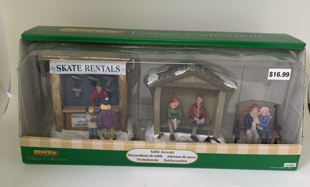 2010 Lemax Skate Rentals Set Of 3-Holiday Village Christmas Accent At the time of this listing, I have other holiday houses and decorations in my store, check them out. This is a preowned, used, Christmas village piece. I do my best to photograph the entire piece and describe them to insure that you know what you are buying. Mistakes can be made or problems missed, it is not intentional. Please review all the photos carefully, so you aren?t disappointed when you receive your item and you know it?s condition. These are fragile items, I do my best to package them well to try to prevent damage during shipment.
