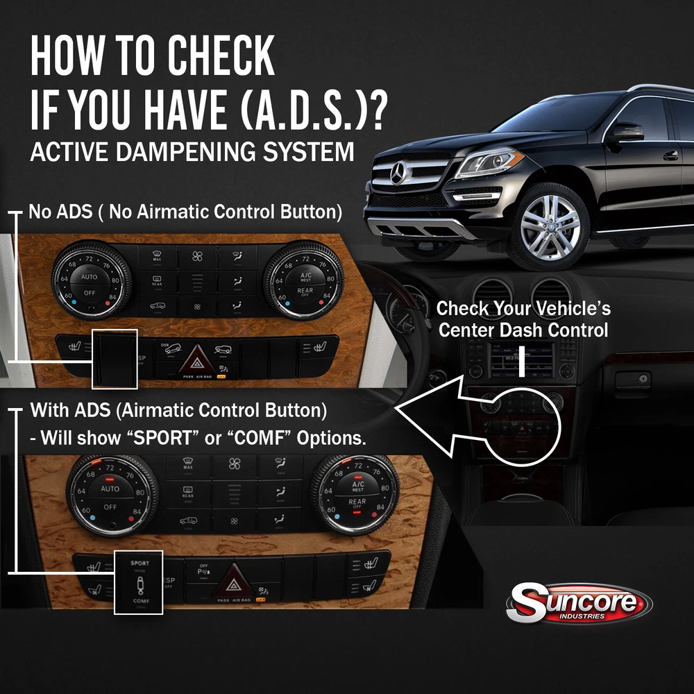 Air Suspension Specialist 2010-2011 Mercedes ML450 Front Air Suspension to Complete Strut Conversion Kit Part # 129M-31-F Condition: New Fits: 2010 - 2011 Mercedes-Benz ML450 KEY FEATURES: Installation Instructions Included Saves You Money Compared To OEM/Dealer Prices Convert from rubber Air to Steel conventional springs. Limited Lifetime Warranty Regain The New Car Feel No Sacrifice Of Ride height Or Quality IMPORTANT FITMENT NOTES (MUST READ): Includes (2) Complete Strut Assemblies Converting Air/Electronic to Standard Suspension INCLUDES (MUST READ): (2) Complete Strut Assemblies Converting Air to Standard Suspension PRODUCT DETAILS & FITMENT INTERCHANGE DATA SHIPPING & WARRANTY ABOUT Suncore’s Front Air Spring to Coil Spring Conversion Kit Part 129M-31-F for your 2010 - 2011 Mercedes-Benz ML450 is the perfect upgrade for an aged and failing air suspension system. Our air to coil spring conversion kits are brand new and built to give your GL320, GL350, GL450 or GL550 a more reliable suspension system. SPECIFICATIONS Position Front WARNING CA Proposition 65 No DETAILED VEHICLE FITMENT Year Make Model Submodel Position Drive Cyl Liter Body Notes 2011 Mercedes-Benz ML450 Hybrid 4Matic Front AWD 6 3.5 Sport Utility Includes (2) Complete Strut Assemblies Converting Air/Electronic to Standard Suspension 2010 Mercedes-Benz ML450 Hybrid 4Matic Front AWD 6 3.5 Sport Utility Includes (2) Complete Strut Assemblies Converting Air/Electronic to Standard Suspension Order Processing: Normal order processing can take between 1-3 business days (Monday-Friday).These days excludes weekends and holidays. Orders placed before 2:00pm EST typically begins processing the same day. Orders placed after 2:00 PM EST. on Friday will not ship until Monday or the following business day. Note: Remanufactured items may take longer as they are built to order and tested vigorously before packing and shipping. Shipping & Delivery: Suncore Industries offers free shipping on thousands of products. Our preferred shipping method is UPS Ground, however smaller items may be shipped USPS First Class or Priority. Delivery times will vary, and products may ship separately from different warehouses located across the United States. Depending on warehouse locations and shipping destination, delivery times can range from 2 to 6 business days. Note: Free shipping is eligible only to U.S. delivery addresses within the 48 states. We do not ship to P.O. Boxes and APO/FPO addresses. Expedited shipping options are available for select items. Some orders may require a signature confirmation at time of delivery. Warranty: Suncore Industries limited warranty covers against defects in material or workmanship from the date of purchase. A dated sales receipt must be included to show your product was purchased within the warranty period. Note: Warranty period varies depending on product, please see product listing for more information. We handle all manufacturer warranty claims on your behalf. Any product found to be defective within 30 days of purchase is eligible for a refund or replacement, however any product found to be defective after 30 days but beforethe warranty period has expired are only eligible for a replacement only. Replacement product does not renew the warranty period. When a product is found to be defective, Suncore Industries will cover the costs of shipping of the replacement part to the original purchaser. Warranty and UPS related claims may require authentication, but not limited to pictures, video, or shipment back to the manufacturer. Note: Do not dispose of defective parts until instructed. If the defective part is requested to be returned to the manufacturer, Suncore Industries will issue a call tag for the original purchaser to ship the product back. The original purchaser is responsible for packaging and delivery to a UPS driver or suitable UPS facility for return shipment. Failure to return the requested product will result in denial of current warranty claim. All returned products must be accompanied by an approved RMA number provided by Suncore Industries. No reimbursements will be given for delay, labor, mileage, car rental, or any other costs involved in installation or re-installation of any product in question. Suncore Industries was established in 2000 and have been a member of the Automotive Parts Rebuilders Association (APRA) ever since. Our mission began with rebuilding air suspension components and moved quickly into offering better solutions with conventional suspension conversion kits to give our customers the longevity they can rely on. The most common reason for an air strut failure is due to dry rotting of the air bag. This is something that happens over time, the air bag starts to deteriorate and causes leaks, when this happens the air bag can no longer hold air pressure. A leaking air bag can cause the strut it fits over to fail as well. The second factor of an air strut failure is the strut itself. The strut is pressurized with fluid, and if the strut begins to fail it will no longer have the same pressure to hold the vehicle. If this system begins to fail one visible sign will be that your vehicle will be lower than factory height. If Air Struts are not replaced on time, it will cause an Air Suspension Compressor Failure.
