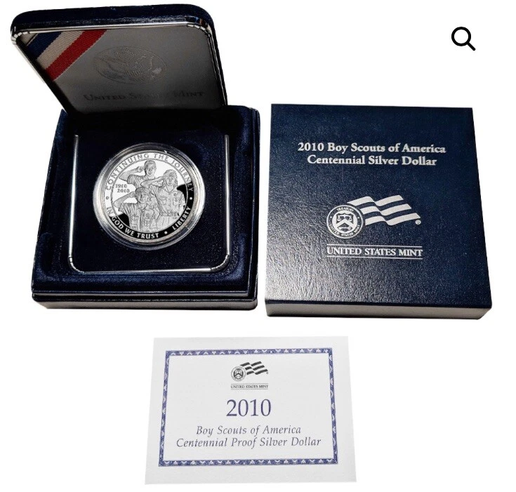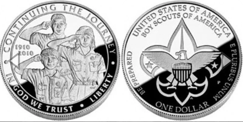 The 2010 Boy Scouts Centennial Silver Dollar was issued to celebrate the 100th anniversary of the founding of the Boy Scouts of America. A commemorative coin program was also subsequently authorized for the Girl Scouts of the United States of America, with the coins issued in 2013. The design of this coin was criticized by some collectors for its inclusion of a female. This design was specifically advocated by the organization in order to reflect the diversity of the nation and how the Boy Scouts had evolved over time to include all of the youth of America. Alternative designs had highlighted the continuity of the organization with images of a 1910 scout and a modern day scout. Ultimately, a design was chosen in accordance with the preference of the organization. The Boy Scouts of America Centennial Silver Dollar was issued in proof and uncirculated versions struck at the Philadelphia Mint. The maximum mintage was established at 350,000 coins across both options. Introductory pricing was in place from the start of sales on March 23, 2010 until April 21, 2010, after which time regular pricing went into effect. Mintage of 244,963 proof coins. A surcharge of $10 was included within the price of each coin, payable to the Boy Scouts of America Foundation. The funds collected were used by local councils for the extension of funding to hard to serve areas.