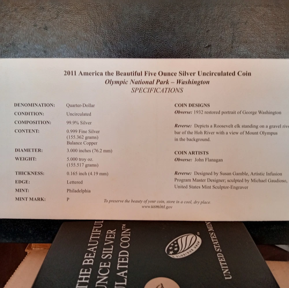 2011 P - Olympic National Park - ATB - 5 oz. Silver Coin - Mint Box & COA - .999