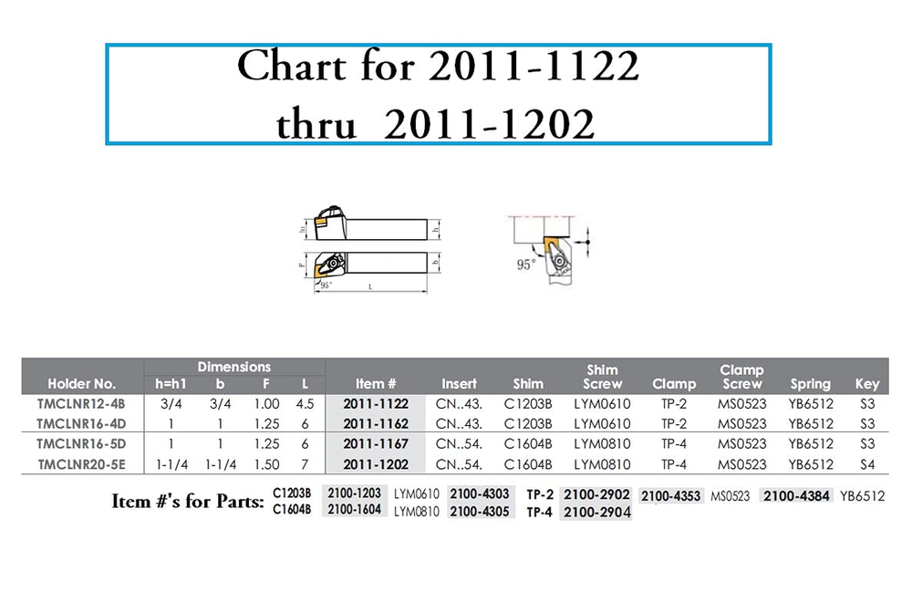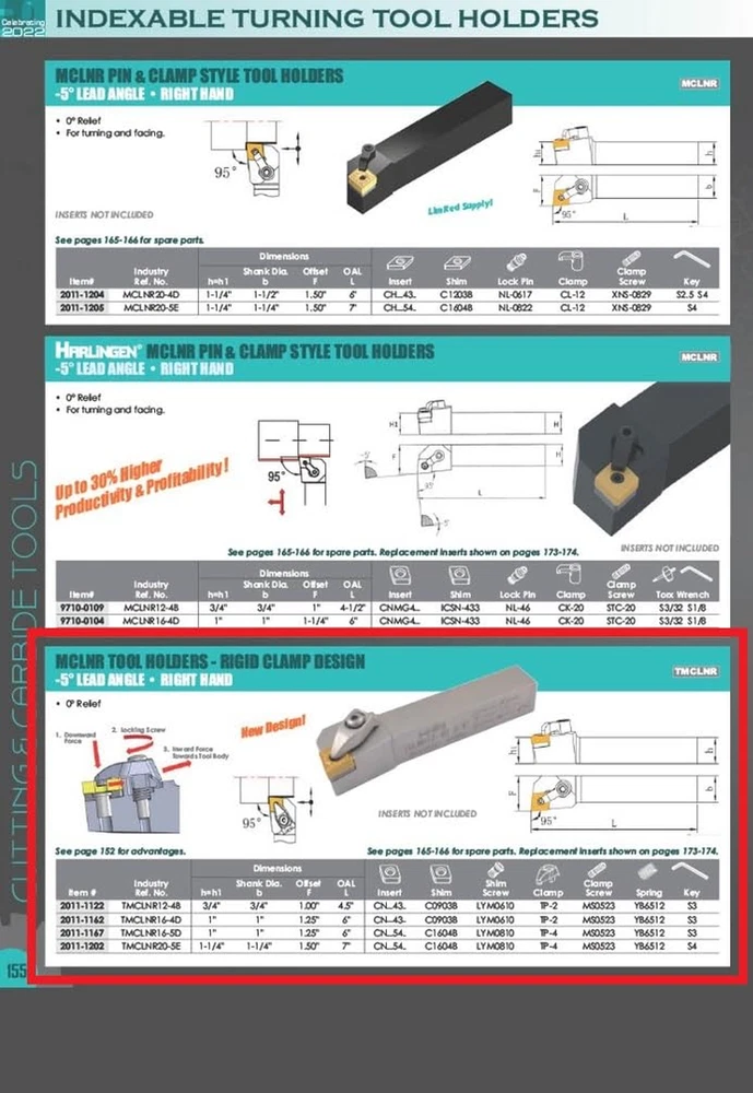 Right hand. Reverse 5 degree lead angle for turning and facing. Zero degree relief. Use with CNMA, CNMG or CNMM inserts. Please see chart picture for sizing information. When replacing the insert, apply enough pressure to push the clamp forward and align it with the hole as you tighten it. Please see the video of the installation process. HHIP MCLNR 16-4D Turning & Facing Tool Holder - New Rigid Clamp Design Right hand. Reverse 5 degree lead angle for turning and facing. Zero degree relief. New rigid style top & hole clamping design provides increased stability & security for productive turning of large components and heavy machining. Use with CNMA, CNMG or CNMM inserts. Please see chart picture for sizing information. When replacing the insert, apply enough pressure to push the clamp forward and align it with the hole as you tighten it. Please see the video of the installation process.