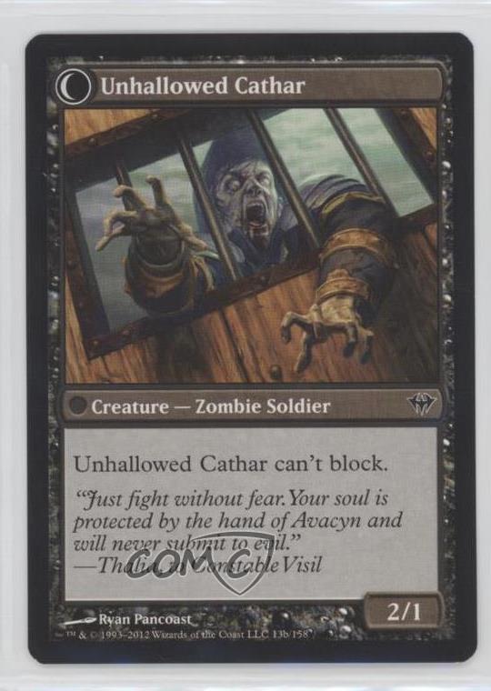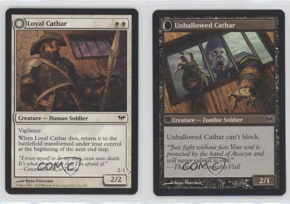 Absolutely love this flip card! The Loyal Cathar // Unhallowed Cathar combo brings such dynamic gameplay—dies as a hero, comes back as a villain. Perfect for graveyard strategies, great condition, and fits my deck flawlessly. A must-have for any MTG collector focusing on Dark Ascension! COMC delivered fast too.