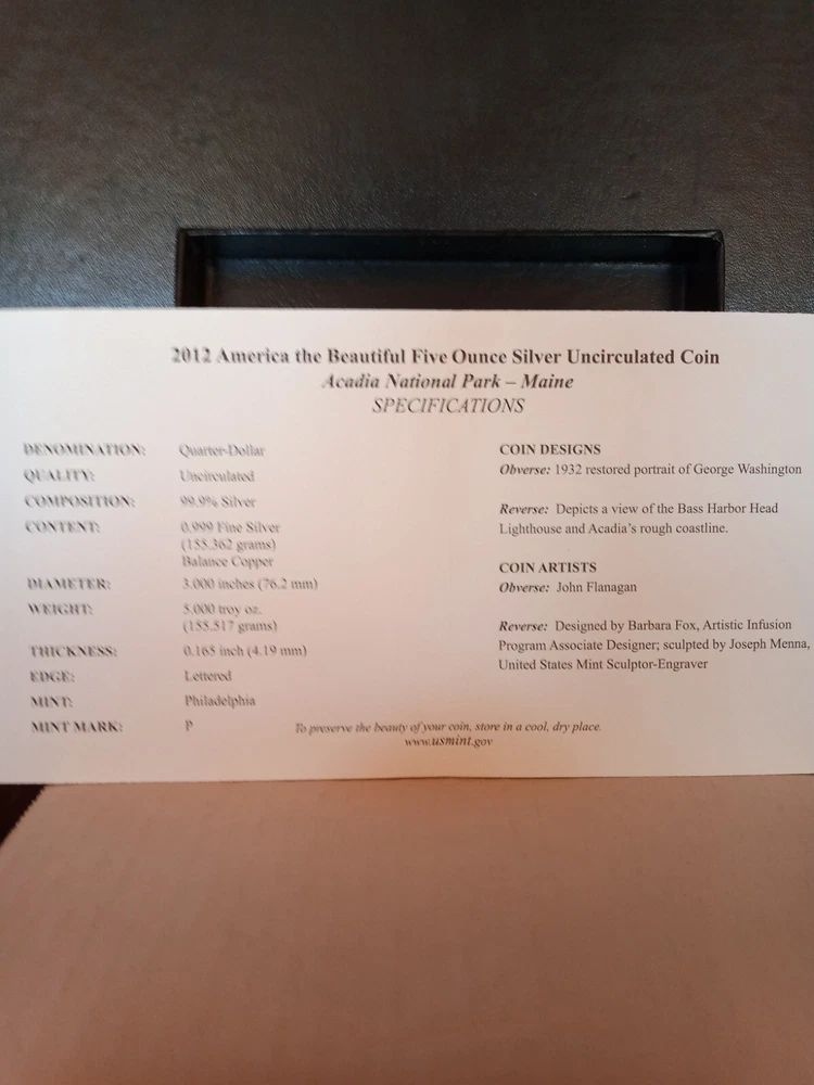 2012 P - Acadia National Park - 5 oz Silver Coin - Mint Box & COA - .999 - ATB
