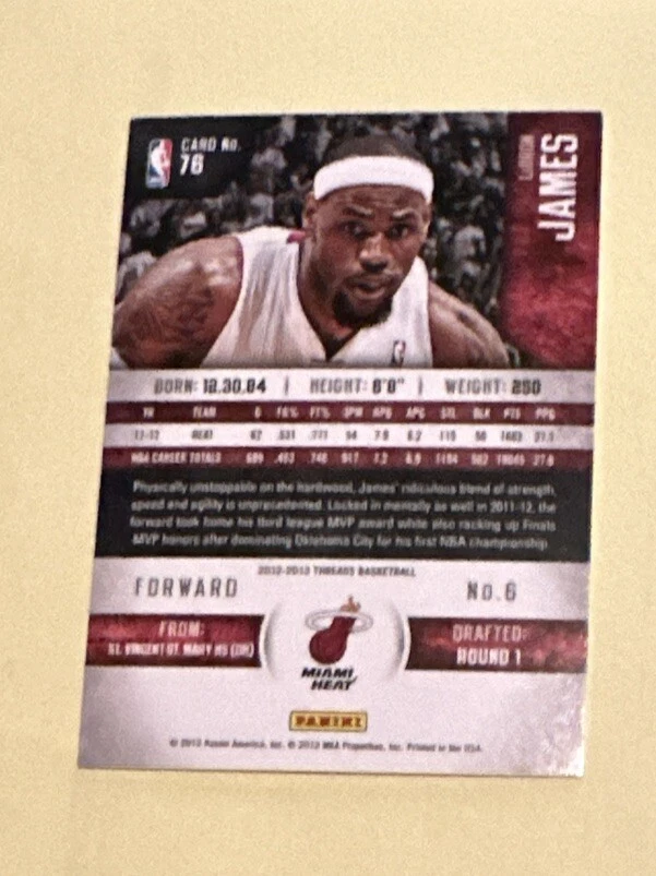 This 2012-13 Panini Threads #76 LeBron James Miami Heat Lakers Cavs trading card is a must-have for any basketball fan. The card features a stunning image of the famous athlete and is part of the base set of the 2012-13 Panini Threads collection. It is an original, licensed reprint and has not been autographed. The card is in standard size and is manufactured by Panini in the United States. It is a sports trading card and is part of the National Basketball Association (NBA) league. The card number is 76 and it is not a vintage item. The language of the card is English and it features no special attributes. Get your hands on this card today and add it to your collection!