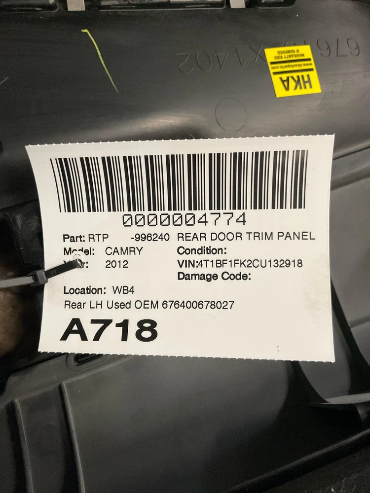 HK Auto Salvage HK Auto Salvage Montebello, CA Business Hours (PST/PDT) Mon - Fri 8am - 5pm Saturday 8am - 2pm Closed Sat & Sun Rear Door Trim Panel Year: 12 Model: TOYOTA CAMRY Side: Left Type: Used Category: Y Condition: VIN: 4T1BF1FK2CU132918 Vehicle Stock #: A718 Part Stock #: 0000004774 Vehicle Info: GRAY EXT/BLACKINTERIOR Additional notes: Rear Lh Used Oem 676400678027 Door Trim Panel Good Condition Used Wear See Pictures To Verify Interchange: Rear Left Inner; Gas; w/leather black Also fits: TOYOTA CAMRY 12 Rear Left Inner; Gas; w/leather black Search for more parts from this donor vehicle Search for more parts for TOYOTA CAMRY Airbag Notification If the item above is an airbag, I certify this airbag is not subject to recall and will be shipped in accordance with hazmat shipping requirements . Payment We accept credit cards through eBay Managed Payments only Sales tax collected by eBay where applicable COD available for orders placed for delivery to local businesses; please contact us prior to purchase to arrange Pay on pickup available for orders placed for local pickup Shipping We ship by FedEx, UPS, and USPS. Most items ship within 24 hours of payment; items paid for on the weekend or holidays ship on the following business day. Any free shipping we offer is for the continental United States only. If you are from Hawaii, Alaska, or a Territory of the United States, please request a shipping total before bidding and we will do our best to keep the cost low. Local delivery and local pickup options are also available. Warranty & Returns 30-day standard warranty on all general parts 90-day standard warranty on engines and transmissions Please verify fitment independently prior to purchase, as the information in the "compatibility" section above is generated by eBay Motors and not from us. If you have questions or concerns about fitment, please contact us prior to purchase. Contact Us If you have any questions regarding an eBay item, please CONTACT US via eBay messaging before you make the purchase. Please verify fitment independently prior to purchase, as the information in the "compatibility" section above is generated by eBay Motors and not from us. If you have questions or concerns about fitment, please contact us prior to purchase. After you have received your product in satisfactory condition, please leave us positive feedback. If there is a problem with your purchase, do not leave neutral or negative feedback: CONTACT US so that we can help you to resolve your issue to your satisfaction. Powered by Checkmate