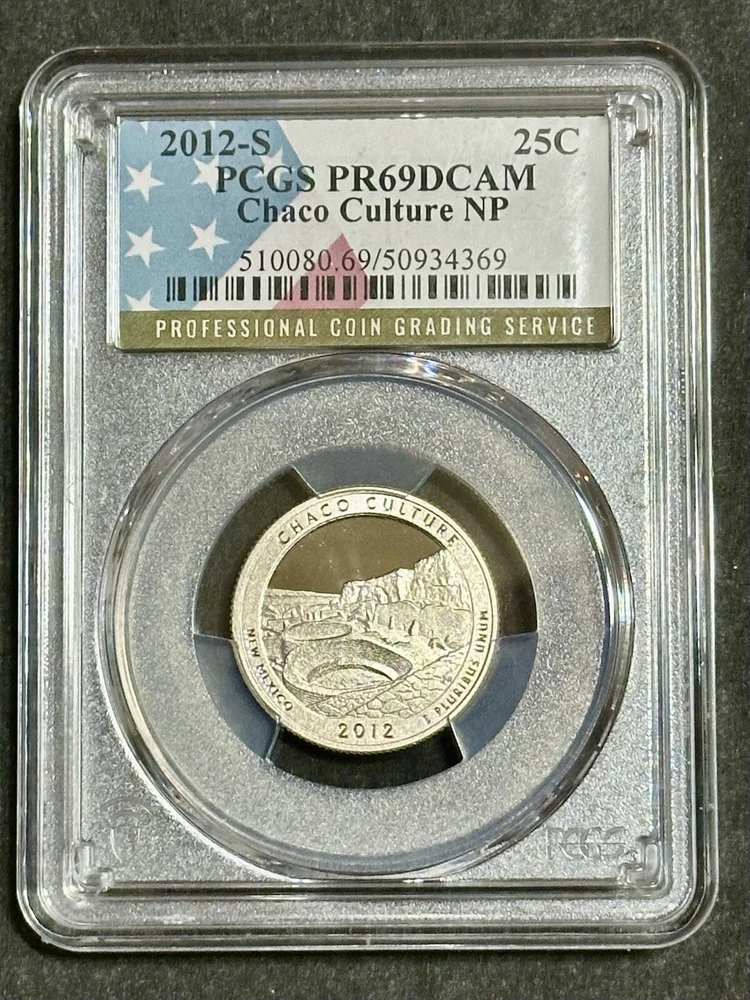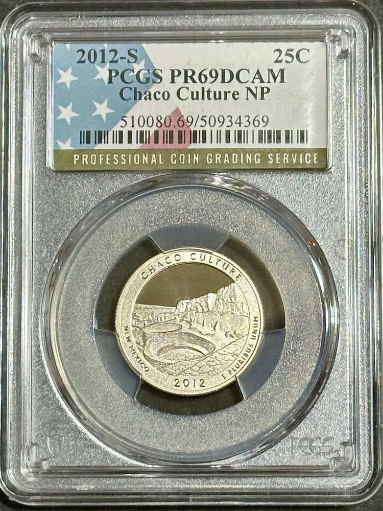 This is a 2012-S Chaco Culture NP Quarter certified by PCGS as PR69DCAM. It is a proof strike type made of copper-nickel with a fineness of 0.9. The coin features the image of Chaco Culture, a historic site in New Mexico, and is part of the America the Beautiful series. The denomination is 25 cents and it was minted in San Francisco. The certification number is 48236516 and it is uncirculated.