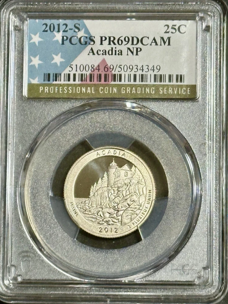 This 2012-S PCGS PR69DCAM Acadia National Park NP Quarter Proof 25C is an incredible addition to any coin collection. With its stunning design, this America the Beautiful quarter showcases the beauty of Acadia National Park in Maine. The coin is made of clad composition with a fineness of 0.9 and was struck in proof condition at the San Francisco Mint. The coin is graded PR 69 by PCGS and comes with certification. This uncirculated quarter is a must-have for any collector, especially those interested in national park quarters. Don't miss your chance to add this rare and beautiful coin to your collection.