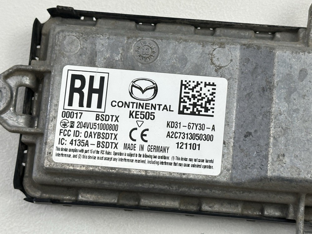 A USED OEM (ORIGNAL FACTORY) 2013-2016 MAZDA CX-5 RIGHT BLIND SPOT ALERT CONTROL MODULE KD31-67Y30-A THAT HAS BEEN CLEANED AND INSPECTED! ALL ORDERS ARE SHIPPED WITHIN 1 BUSINESS DAY. ITEMS PAID FOR ON THE WEEKEND OR HOLIDAYS SHIP ON THE FOLLOWING BUSINESS DAY. YOU WILL RECEIVE EXACTLY THE ITEM THAT IS IN THE PICTURES. IF YOU HAVE ANY QUESTIONS FEEL FREE TO CONTACT US! INTERNATIONAL BUYERS - PLEASE NOTE: IMPORT DUTIES, TAXES, AND CHARGES ARE NOT INCLUDED IN THE ITEM PRICE OR SHIPPING COST. THESE CHARGES ARE THE BUYER'S RESPONSIBILITY. PLEASE CHECK WITH YOUR COUNTRY'S CUSTOMS OFFICE TO DETERMINE WHAT THESE ADDITIONAL COSTS WILL BE PRIOR TO BIDDING OR BUYING. INTERNATIONAL BUYERS - PLEASE NOTE: IMPORT DUTIES, TAXES, AND CHARGES ARE NOT INCLUDED IN THE ITEM PRICE OR SHIPPING COST. THESE CHARGES ARE THE BUYER'S RESPONSIBILITY. PLEASE CHECK WITH YOUR COUNTRY'S CUSTOMS OFFICE TO DETERMINE WHAT THESE ADDITIONAL COSTS WILL BE PRIOR TO BIDDING OR BUYING.