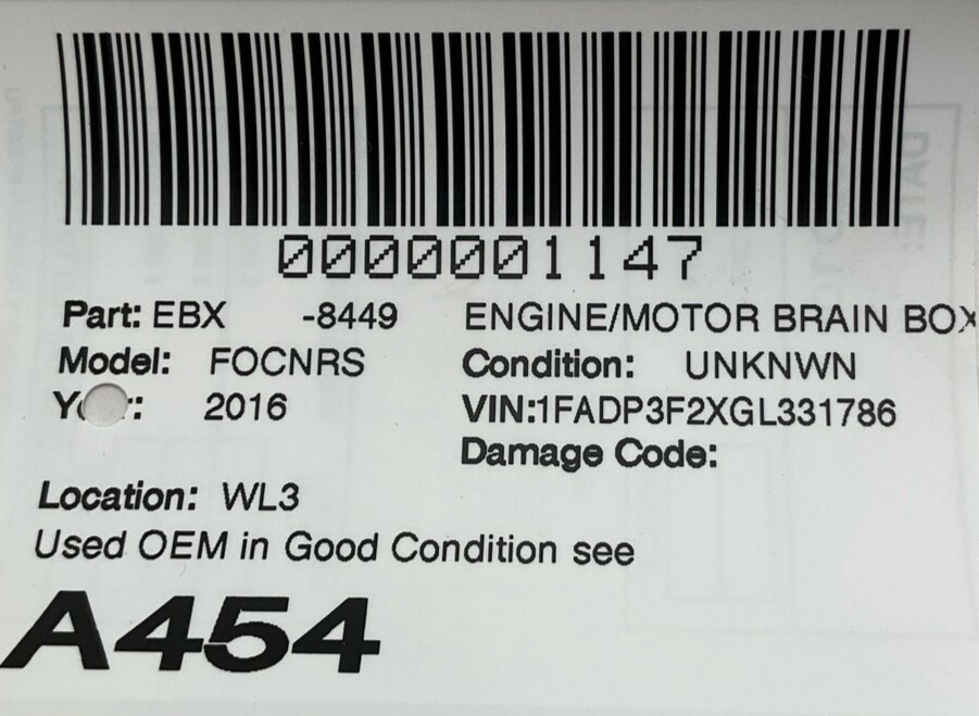 HK Auto Salvage HK Auto Salvage Montebello, CA Business Hours (PST/PDT) Mon - Fri 8am - 5pm Saturday 8am - 2pm Closed Sat & Sun Engine/motor Brain Box Year: 16 Model: FORD FOCUS Side: Type: Used Category: Condition: Unknwn VIN: 1FADP3F2XGL331786 Vehicle Stock #: A454 Part Stock #: 0000001147 Vehicle Info: WHITE EXT,BLACK INT Additional notes: Used Oem In Good Condition See Pictures Interchange: Electronic Control Module, gasoline, 2.0L, w/o turbo; (VIN 2, 8th digit), ID FM5A-ADB Also fits: FORD FOCUS NOT RS 13 Electronic Control Module, gasoline, w/o turbo; (VIN 2, 8th digit), ID DM5A-CA FORD FOCUS NOT RS 13 Electronic Control Module, gasoline, w/o turbo; (VIN 2, 8th digit), ID DM5A-CC Electronic Control Module, gasoline, w/o turbo; (VIN 2, 8th digit), ID DM5A-CD Electronic Control Module, gasoline, w/o turbo; (VIN 2, 8th digit), ID DM5A-CE FORD FOCUS NOT RS 14 Electronic Control Module, gasoline, w/o turbo; (VIN 2, 8th digit), ID EM5A-ACA FORD FOCUS NOT RS 14 Electronic Control Module, gasoline, w/o turbo; (VIN 2, 8th digit), ID EM5A-ACB Electronic Control Module, gasoline, w/o turbo; (VIN 2, 8th digit), ID EM5A-ACC Electronic Control Module, gasoline, w/o turbo; (VIN 2, 8th digit), ID EM5A-ADA Electronic Control Module, gasoline, w/o turbo; (VIN 2, 8th digit), ID EM5A-ADB Electronic Control Module, gasoline, w/o turbo; (VIN 2, 8th digit), ID EM5A-FB Electronic Control Module, gasoline, w/o turbo; (VIN 2, 8th digit), ID EM5A-FC FORD FOCUS NOT RS 15-16 Electronic Control Module, gasoline, 2.0L, w/o turbo; (VIN 2, 8th digit), ID EM5A-ACA FORD FOCUS NOT RS 15-16 Electronic Control Module, gasoline, 2.0L, w/o turbo; (VIN 2, 8th digit), ID EM5A-ACB Electronic Control Module, gasoline, 2.0L, w/o turbo; (VIN 2, 8th digit), ID EM5A-ACC Electronic Control Module, gasoline, 2.0L, w/o turbo; (VIN 2, 8th digit), ID EM5A-ADA Electronic Control Module, gasoline, 2.0L, w/o turbo; (VIN 2, 8th digit), ID EM5A-ADB Electronic Control Module, gasoline, 2.0L, w/o turbo; (VIN 2, 8th digit), ID FM5A-ADB Electronic Control Module, gasoline, 2.0L, w/o turbo; (VIN 2, 8th digit), ID FM5A-HF FORD FOCUS NOT RS 16 Electronic Control Module, gasoline, 2.0L, w/o turbo; (VIN 2, 8th digit), ID CM5A-ATF FORD FOCUS NOT RS 16 Electronic Control Module, gasoline, 2.0L, w/o turbo; (VIN 2, 8th digit), ID RMBV61-BC FORD FOCUS NOT RS 17-18 Electronic Control Module, gasoline, 2.0L, w/o turbo; (VIN 2, 8th digit) Search for more parts from this donor vehicle Search for more parts for FORD FOCUS Airbag Notification If the item above is an airbag, I certify this airbag is not subject to recall and will be shipped in accordance with hazmat shipping requirements . Payment We accept credit cards through eBay Managed Payments only Sales tax collected by eBay where applicable COD available for orders placed for delivery to local businesses; please contact us prior to purchase to arrange Pay on pickup available for orders placed for local pickup Shipping We ship by FedEx, UPS, and USPS. Most items ship within 24 hours of payment; items paid for on the weekend or holidays ship on the following business day. Any free shipping we offer is for the continental United States only. If you are from Hawaii, Alaska, or a Territory of the United States, please request a shipping total before bidding and we will do our best to keep the cost low. Local delivery and local pickup options are also available. Warranty & Returns 30-day standard warranty on all general parts 90-day standard warranty on engines and transmissions Please verify fitment independently prior to purchase, as the information in the "compatibility" section above is generated by eBay Motors and not from us. If you have questions or concerns about fitment, please contact us prior to purchase. Contact Us If you have any questions regarding an eBay item, please CONTACT US via eBay messaging before you make the purchase. Please verify fitment independently prior to purchase, as the information in the "compatibility" section above is generated by eBay Motors and not from us. If you have questions or concerns about fitment, please contact us prior to purchase. After you have received your product in satisfactory condition, please leave us positive feedback. If there is a problem with your purchase, do not leave neutral or negative feedback: CONTACT US so that we can help you to resolve your issue to your satisfaction. Powered by Checkmate