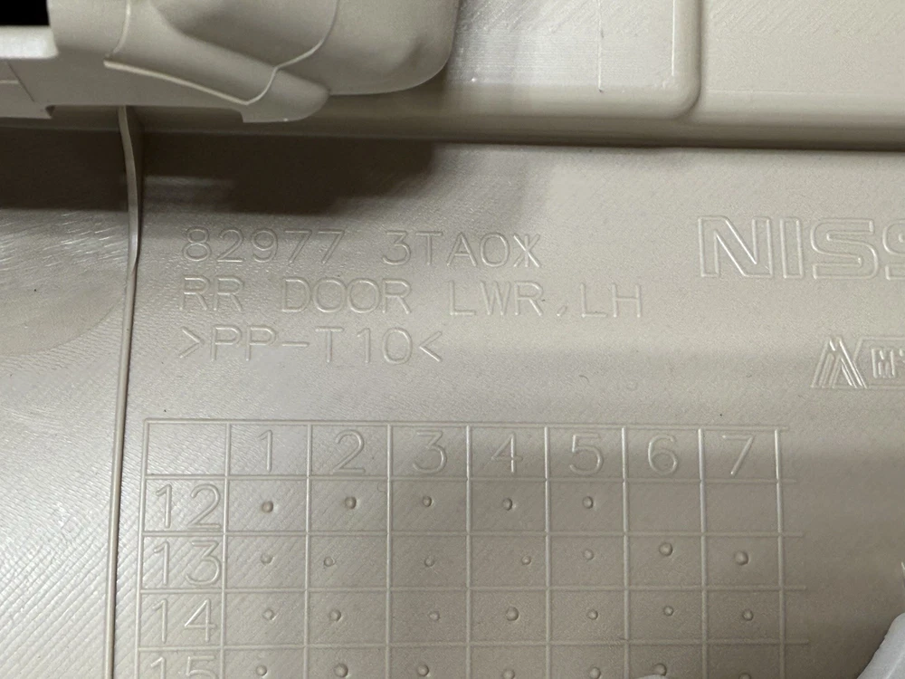 Country of Origin:JapanBrand:NissanManufacturer Part Number:829A1-9HS1APlacement on Vehicle:Door, Door Sill, Left, Rear, Rear LeftColor:BeigeType:Door PanelVintage Part:NoMaterial:PlasticOE/OEM Part Number:82911-3TA0