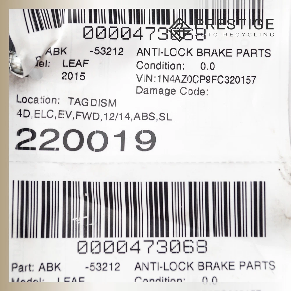 Prestige Auto Parts - Product Page Local pick-up available at 3400 Sunrise Blvd, Rancho Cordova, CA 95742 2014-2015 NISSAN LEAF ABS Anti-Lock Brake Pump Modulator 47660-4NA1A OEM Not sure if the part fits? Send us your VIN, and we'll verify compatibility for you! Item Condition The item is in good condition, fully operational, and demonstrates normal signs of use. Please note that, as a used part, it may show light scuffs, scratches, or other minor imperfections, as shown in the photos provided. WHEN YOU BUY FROM US YOU AGREE TO OUR TERMS AND CONDITIONS: It is the buyer's responsibility to carefully inspect all of the photos for details and/or request more photos if necessary, what you see in photos is exactly what you will receive. Before purchase, the buyer MUST verify that the item will fit their vehicle. PLEASE NOTE: Make sure to verify fitment independently with your local dealer, information in the “compatibility” section is generated by eBay Motors, not from us. IF YOU HAVE ANY QUESTIONS, CONTACT US VIA EBAY MESSAGING BEFORE PURCHASING. Payment We accept PayPal, VISA, MasterCard, Discover, and American Express. Sales tax collected by eBay where applicable. For local orders, pay on pickup available. Shipping Most items ship within 24 hours of payment; items paid for on the weekend or holidays ship on the following business day. We ship by FedEx, UPS, USPS, and regional freight/LTL carriers, whichever option is most affordable and/or faster. Shipping prices for ground apply only to the continental United States. Anywhere else is considered international shipping and will have an international shipping rate. Any international customs fees are the responsibility of the buyer. Any free shipping we offer is for the continental United States only. If you are from Hawaii, Alaska, or a Territory of the United States, please request a shipping total before bidding and we will do our best to keep the cost low. For orders placed outside of the United States, we ship ONLY through the eBay Global Shipping Program. If you are outside of the US, use the eBay international shipping tool above to receive a price for shipping costs. Local pickup and delivery options also available, please contact us for arrangements. PLEASE NOTE: Oversized items like engines, transmissions, bumpers, doors, hoods, trunk lids, fenders and other similar items will be shipped via Freight Shipping and MUST be shipped to a business address with a dock or forklift access; otherwise, liftgate and/or residential delivery fees may apply. YOU MUST CONTACT US FIRST FOR A QUOTE BEFORE PURCHASING SAID ITEMS. Warranty and Returns All returns must be made within 30 days of item being received by the customer only if the item is non-functional or if it differs substantially from the description. Buyer is fully responsible for shipping cost of the return. We are not liable to pay for any labor fees associated with the installation or removal of any parts sold by us. All electronics are tested before removed from vehicle. IF NOT FUNCTIONAL, WE WILL NOT SELL. If the item is defected we will state accordingly and is sold for parts only. If you have any questions about the part you’re bidding on, PLEASE ASK QUESTIONS PRIOR TO BIDDING. 90 DAY WARRANTIES are available. Contact Us If you have questions about any part, please contact us BEFORE purchasing via eBay messaging. HOW DID WE DO? We are a small, family owned business dependent on our valuable customers. Once you have received your item in satisfactory condition, would you be so kind as to leave us feedback? If there is a concern that would cause you to want to leave negative feedback, please contact us first and we will do our best to resolve the issue. Thank you and God bless! © 2025 Prestige Auto Recycling. All rights reserved.
