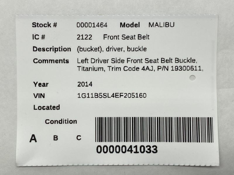 Hollander Welcome to our eBay store! Left Driver Side Front Seat Belt Buckle Fits 2014-2016 Chevrolet Malibu 83212 Description This listing is for a used Left Driver Side Front Seat Belt Buckle. The part pictured is the actual item you will receive, no other parts are included. This part is used so normal wear is to be expected. Please see part fitment information below and please match part numbers before buying this item. If you have any questions please let us know. Donor Vehicle Model : MALIBU Year : 2014 Mileage : 0 (0 = not available or unknown) Stock Number : 001464 Notes : LEFT DRIVER SIDE FRONT SEAT BELT BUC 010725 This Part Will Fit These Makes And Models With These Options MALIBU 14-15 (bucket), driver, buckle MALIBU 16 (bucket), VIN 1 (4th digit, Limited), driver, buckle XTS 14-19 driver, buckle About Us Payment Shipping Returns Warranty About Us Please contact us with any questions BEFORE purchasing. If you are unsure if this part will fit we are happy to verify fitment for you prior to purchase via your vehicle's VIN (Vehicle Identification Number). We try to answer all messages in 24 hours. Please note that orders are sent to the shipping department throughout the day therefore we cannot guarantee adjustments to orders after payment is received. Our hours of operation are: Monday - Friday 8:00AM - 5:00 PM CST Saturday - Sunday Closed Payment All orders must be paid in full prior to shipment. Payments are processed through eBay. We accept credit card and cash for Local Pickup orders. If payment is not received, an Unpaid Item case will be opened for the sake of seller fee reimbursement. Sales tax will be collected by eBay where applicable. Shipping We ship items via UPS, USPS, or LTL Freight Carriers. Tracking information is uploaded to the order once the item is shipped. Larger items such as Engines, Transmissions, Doors, Tailgates, Trunk Lids, Rear Axles etc. will ship via freight. Freight items are unable to be shipped until we have all the necessary information required by the carrier. Typically that includes a valid business name, address, valid phone number, and hours of operation. Be sure to provide us with all necessary contact information with your order as well. Freight charges are for zoned commercial addresses with a forklift or loading dock. If the location requires the assistance of a lift gate there will be an additonal fee. If a commercial address is not able to be provided we can ship the item to your residence for an additional fee. Add $100 for Residential delivery Add $85 for Liftgate delivery Most orders are shipped within one business day. If there is an issue with your order or item we will reach out to you before we ship the order. Once payment is received for a freight item we will send a message asking for additional information needed for the freight carrier. Without this information we will not be able to ship your item. If a USPS or UPS item is damaged during shipping please keep all packaging and loose parts complete with the package. Send us a message through Ebay with some pictures and your invoice number. We will work on getting a replacement item to you while handling the UPS claim as well. Please Inspect all freight shipments before signing for them at time of delivery! If there has been any damage to the item during shipping inspect the item to see if you can still use it or not. If you can still use the item, notate the damage on the delivery ticket that the driver is keeping then hand it back to them. Send us a message with a copy of your receipt and the delivery ticket you kept. We will take care of the damage claim with the freight carrier. If you cannot use the product simply decline the shipment send us a message and we will work on getting a replacement or refund to you. It is very important to not sign for any damaged product without notating it on the delivery ticket or denying the shipment. You have the right to inspect the package for obvious signs of damage prior to signing and accepting the delivery. If a delivery driver is refusing to let you inspect the shipment before you sign for it, do not sign, refuse the shipment and contact us through eBay messaging. When you sign for the delivery on the carrier's Bill Of Lading (BOL) it is accepting the merchandise as is and in good order. So please inspect your package before signing for it. We do understand that sometimes there will be damage that is missed, don’t worry we will still be able to help you. If you do find concealed damage after you sign for the package let us know through messages and send some pictures as well. We will get with the freight company and start a claim. We are not responsible for any delays incurred by the shipping company. No International shipping is available outside of the eBay Global Shipping program. We do not ship to PO Boxes, Hawaii, Alaska, Puerto Rico, APO, FPO, AA, AE, AP and U.S. Territories outside of the continental U.S. International orders are shipped via eBay’s Global Shipping Program. Customer pickup at our location is also available. Please contact us prior to your purchase to arrange pick up. Returns If you need to return an item for any reason please contact us first to obtain a RMA number (Return Material Authorization). All returns must be authorized by us before being shipped back. Any items returned must include an RMA number clearly written on the side of the packaging. If you are returning a part because you bought the wrong one or no longer need it the original shipping charges are not refunded and you are responsible for the return shipping. All returns must be made within 30 days of the date of purchase. All parts must be returned in their original condition to receive full credit Once you obtain an RMA number, ship the item back to: Frontier Auto Parts, 2199 Ranger Hwy, Weatherford, TX 76088 Warranty All parts we sell through eBay Motors come with a 30-day warranty and a 30 day return period unless otherwise stated. No 
