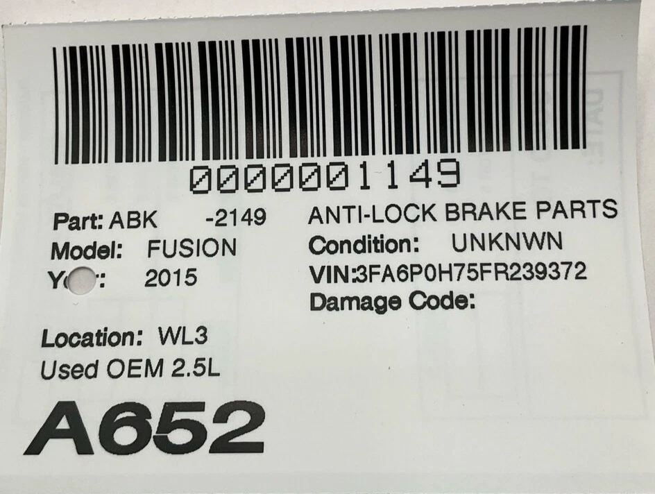 HK Auto Salvage HK Auto Salvage Montebello, CA Business Hours (PST/PDT) Mon - Fri 8am - 5pm Saturday 8am - 2pm Closed Sat & Sun Anti-lock Brake Parts Year: 15 Model: FORD FUSION Side: Type: Used Category: Condition: Unknwn VIN: 3FA6P0H75FR239372 Vehicle Stock #: A652 Part Stock #: 0000001149 Vehicle Info: WHITE EXT Additional notes: Used Oem 2.5l Interchange: Assembly, 2.5L Also fits: FORD FUSION 14 Assembly, 1.6L FORD FUSION 14-16 Assembly, 2.0L, VIN 9 (8th digit, turbo) FORD FUSION 14-16 Assembly, 2.5L FORD FUSION 14-16 Assembly, 1.5L, w/o automatic engine stop and start LINCOLN MKZ 14-16 Assembly, 2.0L, VIN 9 (8th digit, turbo) LINCOLN MKZ 14-16 Assembly, 3.7L Search for more parts from this donor vehicle Search for more parts for FORD FUSION Airbag Notification If the item above is an airbag, I certify this airbag is not subject to recall and will be shipped in accordance with hazmat shipping requirements . Payment We accept credit cards through eBay Managed Payments only Sales tax collected by eBay where applicable COD available for orders placed for delivery to local businesses; please contact us prior to purchase to arrange Pay on pickup available for orders placed for local pickup Shipping We ship by FedEx, UPS, and USPS. Most items ship within 24 hours of payment; items paid for on the weekend or holidays ship on the following business day. Any free shipping we offer is for the continental United States only. If you are from Hawaii, Alaska, or a Territory of the United States, please request a shipping total before bidding and we will do our best to keep the cost low. Local delivery and local pickup options are also available. Warranty & Returns 30-day standard warranty on all general parts 90-day standard warranty on engines and transmissions Please verify fitment independently prior to purchase, as the information in the "compatibility" section above is generated by eBay Motors and not from us. If you have questions or concerns about fitment, please contact us prior to purchase. Contact Us If you have any questions regarding an eBay item, please CONTACT US via eBay messaging before you make the purchase. Please verify fitment independently prior to purchase, as the information in the "compatibility" section above is generated by eBay Motors and not from us. If you have questions or concerns about fitment, please contact us prior to purchase. After you have received your product in satisfactory condition, please leave us positive feedback. If there is a problem with your purchase, do not leave neutral or negative feedback: CONTACT US so that we can help you to resolve your issue to your satisfaction. Powered by Checkmate