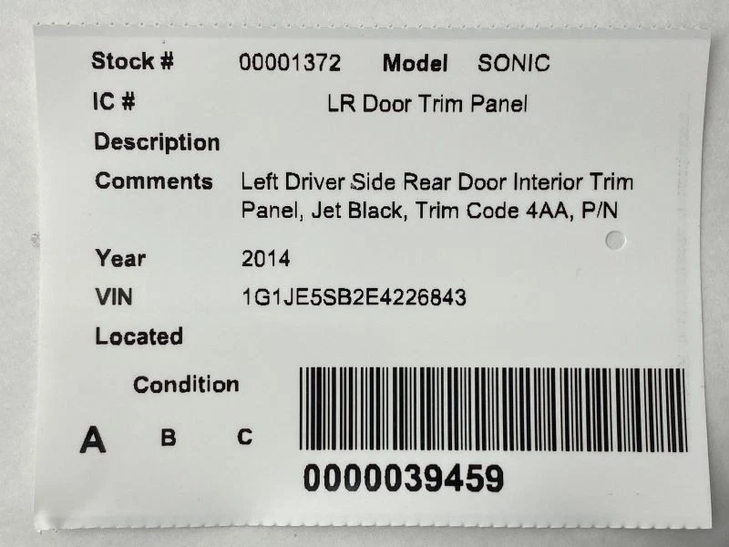 Hollander Welcome to our eBay store! Left Driver Side Rear Door Trim Panel Fits 2014-2018 Chevrolet Sonic Sedan 66700 Description This listing is for a used Left Driver Side Rear Door Interior Trim Panel. The part pictured is the actual item you will receive, no other parts are included. This part is used so normal wear, such as scratches, scuffs or fading is to be expected. Please see part fitment information below and please match part numbers before buying this item. If you have any questions please let us know. Donor Vehicle Model : SONIC Year : 2014 Mileage : 19000 (0 = not available or unknown) Stock Number : 001372 Notes : LEFT DRIVER SIDE REAR DOOR INTERIOR 042225 This Part Will Fit These Makes And Models With These Options About Us Payment Shipping Returns Warranty About Us Please contact us with any questions BEFORE purchasing. If you are unsure if this part will fit we are happy to verify fitment for you prior to purchase via your vehicle's VIN (Vehicle Identification Number). We try to answer all messages in 24 hours. Please note that orders are sent to the shipping department throughout the day therefore we cannot guarantee adjustments to orders after payment is received. Our hours of operation are: Monday - Friday 8:00AM - 5:00 PM CST Saturday - Sunday Closed Payment All orders must be paid in full prior to shipment. Payments are processed through eBay. We accept credit card and cash for Local Pickup orders. If payment is not received, an Unpaid Item case will be opened for the sake of seller fee reimbursement. Sales tax will be collected by eBay where applicable. Shipping We ship items via UPS, USPS, or LTL Freight Carriers. Tracking information is uploaded to the order once the item is shipped. Larger items such as Engines, Transmissions, Doors, Tailgates, Trunk Lids, Rear Axles etc. will ship via freight. Freight items are unable to be shipped until we have all the necessary information required by the carrier. Typically that includes a valid business name, address, valid phone number, and hours of operation. Be sure to provide us with all necessary contact information with your order as well. Freight charges are for zoned commercial addresses with a forklift or loading dock. If the location requires the assistance of a lift gate there will be an additonal fee. If a commercial address is not able to be provided we can ship the item to your residence for an additional fee. Add $100 for Residential delivery Add $85 for Liftgate delivery Most orders are shipped within one business day. If there is an issue with your order or item we will reach out to you before we ship the order. Once payment is received for a freight item we will send a message asking for additional information needed for the freight carrier. Without this information we will not be able to ship your item. If a USPS or UPS item is damaged during shipping please keep all packaging and loose parts complete with the package. Send us a message through Ebay with some pictures and your invoice number. We will work on getting a replacement item to you while handling the UPS claim as well. Please Inspect all freight shipments before signing for them at time of delivery! If there has been any damage to the item during shipping inspect the item to see if you can still use it or not. If you can still use the item, notate the damage on the delivery ticket that the driver is keeping then hand it back to them. Send us a message with a copy of your receipt and the delivery ticket you kept. We will take care of the damage claim with the freight carrier. If you cannot use the product simply decline the shipment send us a message and we will work on getting a replacement or refund to you. It is very important to not sign for any damaged product without notating it on the delivery ticket or denying the shipment. You have the right to inspect the package for obvious signs of damage prior to signing and accepting the delivery. If a delivery driver is refusing to let you inspect the shipment before you sign for it, do not sign, refuse the shipment and contact us through eBay messaging. When you sign for the delivery on the carrier's Bill Of Lading (BOL) it is accepting the merchandise as is and in good order. So please inspect your package before signing for it. We do understand that sometimes there will be damage that is missed, don’t worry we will still be able to help you. If you do find concealed damage after you sign for the package let us know through messages and send some pictures as well. We will get with the freight company and start a claim. We are not responsible for any delays incurred by the shipping company. No International shipping is available outside of the eBay Global Shipping program. We do not ship to PO Boxes, Hawaii, Alaska, Puerto Rico, APO, FPO, AA, AE, AP and U.S. Territories outside of the continental U.S. International orders are shipped via eBay’s Global Shipping Program. Customer pickup at our location is also available. Please contact us prior to your purchase to arrange pick up. Returns If you need to return an item for any reason please contact us first to obtain a RMA number (Return Material Authorization). All returns must be authorized by us before being shipped back. Any items returned must include an RMA number clearly written on the side of the packaging. If you are returning a part because you bought the wrong one or no longer need it the original shipping charges are not refunded and you are responsible for the return shipping. All returns must be made within 30 days of the date of purchase. All parts must be returned in their original condition to receive full credit Once you obtain an RMA number, ship the item back to: Frontier Auto Parts, 2199 Ranger Hwy, Weatherford, TX 76088 Warranty All parts we sell through eBay Motors come with a 30-day warranty and a 30 day return period unless otherwise stated. No labor warranty is provided. In the event a part sold with a warranty fails to