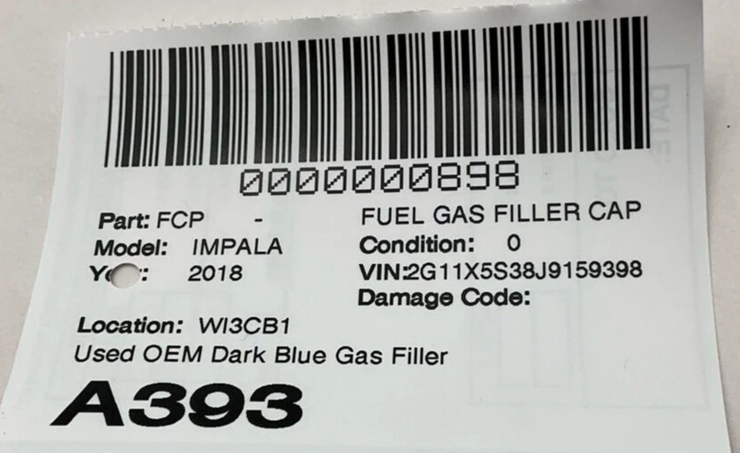 HK Auto Salvage HK Auto Salvage Montebello, CA Business Hours (PST/PDT) Mon - Fri 8am - 5pm Saturday 8am - 2pm Closed Sat & Sun Fuel Gas Filler Cap Year: 18 Model: CHEVY IMPALA Side: Type: Used Category: Condition: 0 VIN: 2G11X5S38J9159398 Vehicle Stock #: A393 Part Stock #: 0000000898 Vehicle Info: DARK BLUE EXT,LIGHT GRAY INT Additional notes: Used Oem Dark Blue Gas Filler Cap Door Good Conditon See Pictures Interchange: Also fits: Search for more parts from this donor vehicle Search for more parts for CHEVY IMPALA Airbag Notification If the item above is an airbag, I certify this airbag is not subject to recall and will be shipped in accordance with hazmat shipping requirements . Payment We accept credit cards through eBay Managed Payments only Sales tax collected by eBay where applicable COD available for orders placed for delivery to local businesses; please contact us prior to purchase to arrange Pay on pickup available for orders placed for local pickup Shipping We ship by FedEx, UPS, and USPS. Most items ship within 24 hours of payment; items paid for on the weekend or holidays ship on the following business day. Any free shipping we offer is for the continental United States only. If you are from Hawaii, Alaska, or a Territory of the United States, please request a shipping total before bidding and we will do our best to keep the cost low. Local delivery and local pickup options are also available. Warranty & Returns 30-day standard warranty on all general parts 90-day standard warranty on engines and transmissions Please verify fitment independently prior to purchase, as the information in the "compatibility" section above is generated by eBay Motors and not from us. If you have questions or concerns about fitment, please contact us prior to purchase. Contact Us If you have any questions regarding an eBay item, please CONTACT US via eBay messaging before you make the purchase. Please verify fitment independently prior to purchase, as the information in the "compatibility" section above is generated by eBay Motors and not from us. If you have questions or concerns about fitment, please contact us prior to purchase. After you have received your product in satisfactory condition, please leave us positive feedback. If there is a problem with your purchase, do not leave neutral or negative feedback: CONTACT US so that we can help you to resolve your issue to your satisfaction. Powered by Checkmate