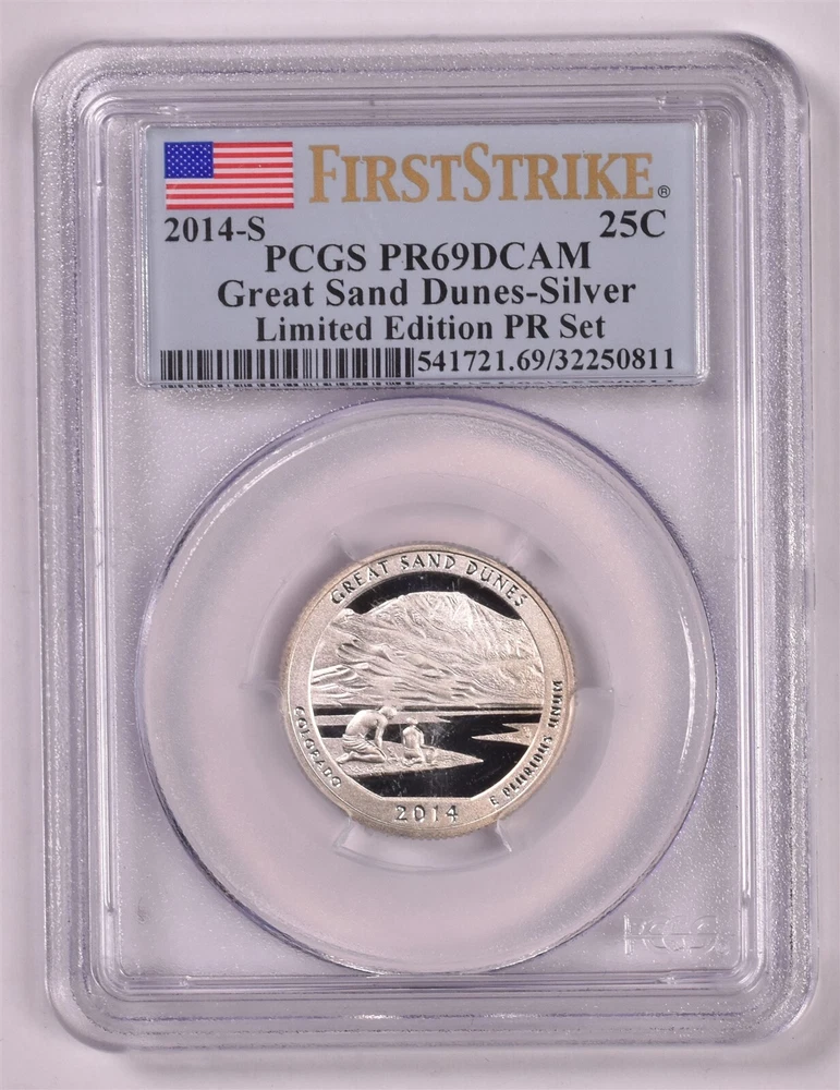 2014-S Great Sand Dunes Silver Quarter - PCGS PR69 DCAM First Strike Limited Ed Item in photos is the actual item you will receive, except when "STOCK PHOTOS" is noted above. Item ID: 58279 Shipping: We combine shipping for multiple item purchases - MUST BE PAID TOGETHER! PLEASE - Bid and buy at your leisure for combined shipping - we request you pay combined items within 10 days of first item won. We are unable to honor requests for combined shipping discounts if items have been paid separately. eBay does show our combined shipping on the shipping tab. If you're purchasing a large number of items, or several boxed items, request a total from seller and we'll pre-pack to get you an accurate shipping cost. We use Flat Rate mailing supplies as much as possible. FAST shipping via United States Postal Service (USPS) We ship Monday - Friday every week, excluding holidays. Most orders paid by 10AM Eastern Time on weekdays will ship same day. When your order is ready for dispatch: - Tracking will be updated on the order details - Tracking will be e-mailed to your registered eBay e-mail address - Positive feedback will be left. If you have not received tracking details or Positive Feedback within 5 days of your payment, contact us through your order details page. Insurance: Your investment is covered by third party parcel insurance and/or U.S. Postal Service Insurance. By bidding/buying, you agree to cooperate with the insurance claims process on lost, stolen, or damaged shipments. If you would like details on the claims process before bidding, feel free to e-mail us. Tax: eBay collects and administers the Sales Tax on a per-state basis. We have no control over the administration of tax. Requests for refunds of Sales Tax will not be honored. If you feel an exemption is warranted, we can only recommend you contact eBay directly. Returns: We accept returns for refund on all unaltered items within 30 days. - Coins removed from their packaging are non returnable. - Items sold as sealed or unopened are non returnable if opened. - We do not charge a restocking fee nor do we refund postage charges. All returns must be handled through eBay's automated return process. No returns on items marked FINAL SALE or AS-IS.