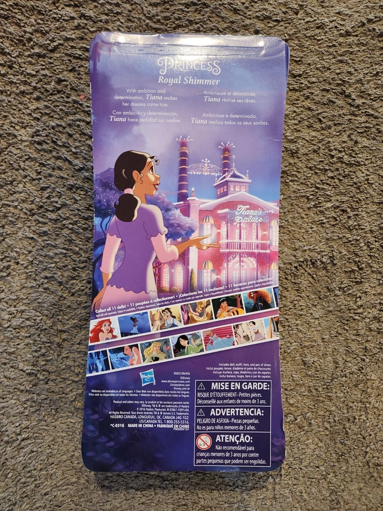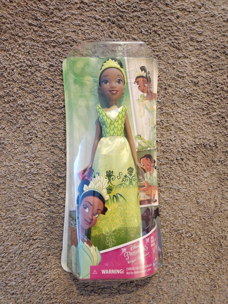 This 2015 Disney Royal Shimmer Tiana doll from The Princess and the Frog franchise is a must-have for any Disney fan. The 12-inch doll features curly black hair, dark complexion, and brown eyes. She comes dressed in her removable clothes and is an original, licensed reproduction. This doll is perfect for all occasions and recommended for ages 3 and up. It is a great addition to any collection and makes a wonderful gift for youth and adults alike. The packaging is original and unopened, although there is some damage to the box. Get your hands on this beautiful doll and add some magic to your life!