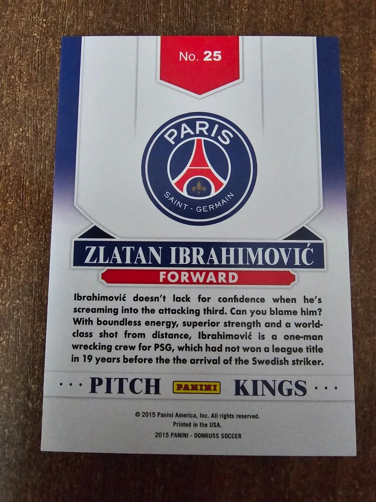 Own a piece of soccer history with the 2015 Donruss Pitch Kings Zlatan Ibrahimovic trading card. This rare sports trading card features the legendary player from Paris Saint-Germain and is a must-have for any collector. Produced by Donruss in 2015, this card is part of the exclusive Press Proof Silver parallel/variety set, with only 199 cards ever produced. The card showcases Ibrahimovic in action during the 2015-16 season of UEFA Champions League and French Ligue 1. It is perfect for fans and collectors alike, whether you're looking to complete your set or add to your sports memorabilia collection. Get your hands on this limited edition card today!