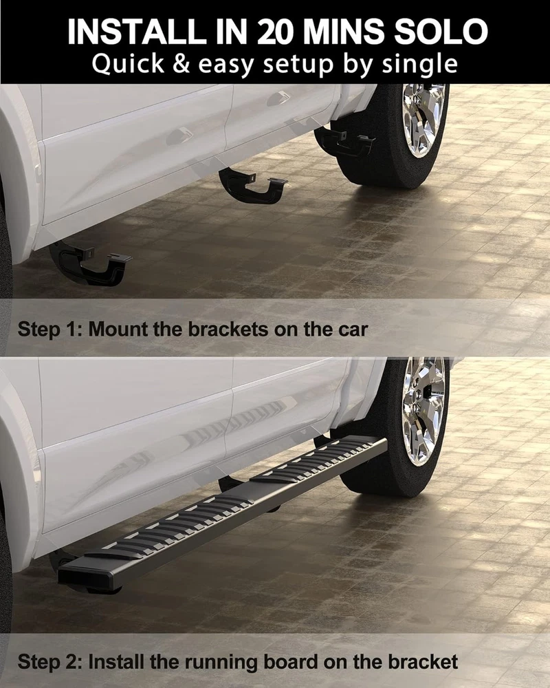 These running boards are a perfect addition to my Chevy Colorado! The sleek black aluminum looks great and feels sturdy. The non-slip pads make stepping in and out easy, even in bad weather. Installation was straightforward, and they fit like they were made for my truck. Love the textured stainless steel skirt—adds a rugged yet polished look. Highly recommend for anyone wanting both style and functionality!