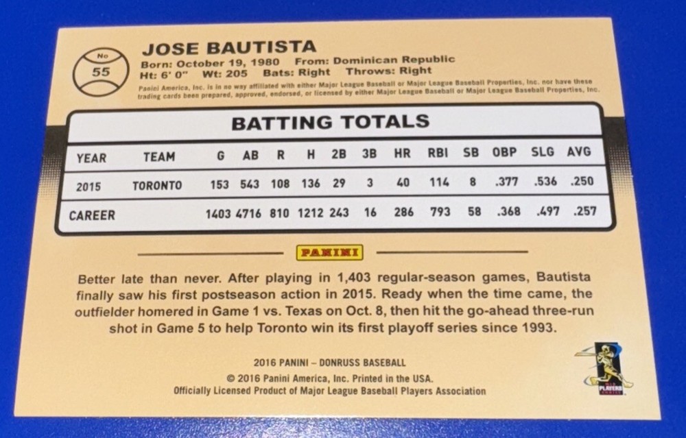 This is a 2016 Donruss sports trading card featuring Jose Bautista, a former baseball player for the Toronto Blue Jays in Major League Baseball (MLB). The card is a part of the base set and is a short print parallel/variety. It has the card number 55 and is from the 2016 season. The card is manufactured in the United States by Donruss and is not autographed.