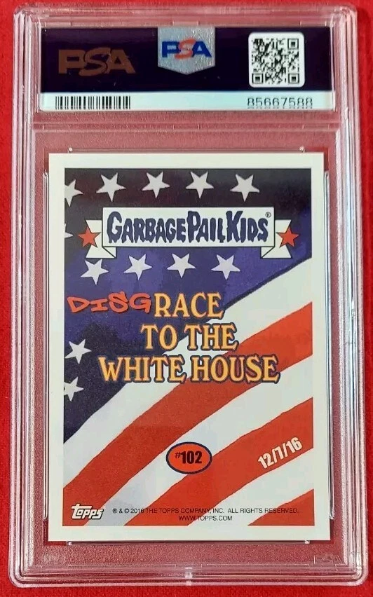 This limited edition Garbage Pail Kids Disg-Race to the White House trading card features Donald Trump and is a must-have for any collector. The art is a parody of Trump's Times Magazine cover. It is graded at a PSA 8. The card's unique design make it a valuable addition to any collection. This card is a rare find and is sure to impress any collector looking for a valuable addition to their collection. This is an amazing addition to any GPK fan or Trump fan's collection. Feel free to ask questions. Thanks for looking!