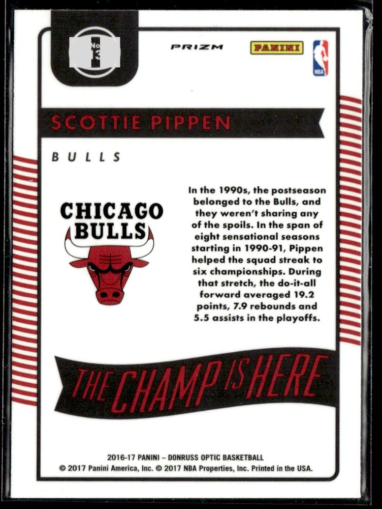 For sale is 2016-17 Donruss Optic Scottie Pippen The Champ is Here Holo as seen in the picture. Please review all pictures and if you have any questions, please reach out to ask. Some card images are taken using a scanner so it may distort the image a little bit. Also please see my ebay store to see any possible ongoing promotions currently happening. Thanks and happy shopping.
