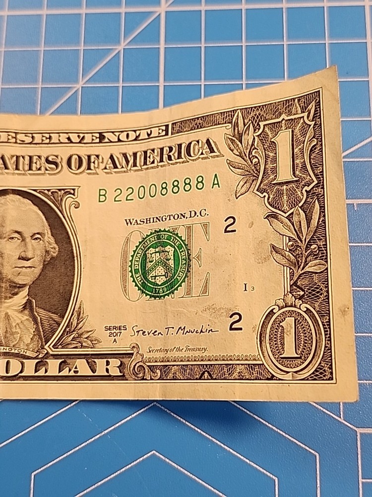 The product is a 2017 $1 Federal Reserve Note with the trinary number repeated three times, specifically #B22008888A. This banknote is circulated and originates from the United States. It is not graded or certified, making it a unique and collectible piece of American currency. I offer fast shipping with postal proof packaging. Over twenty years of selling on ebay, your satisfaction is guaranteed. Please check out my other listings for additional offers. Thank you for looking.