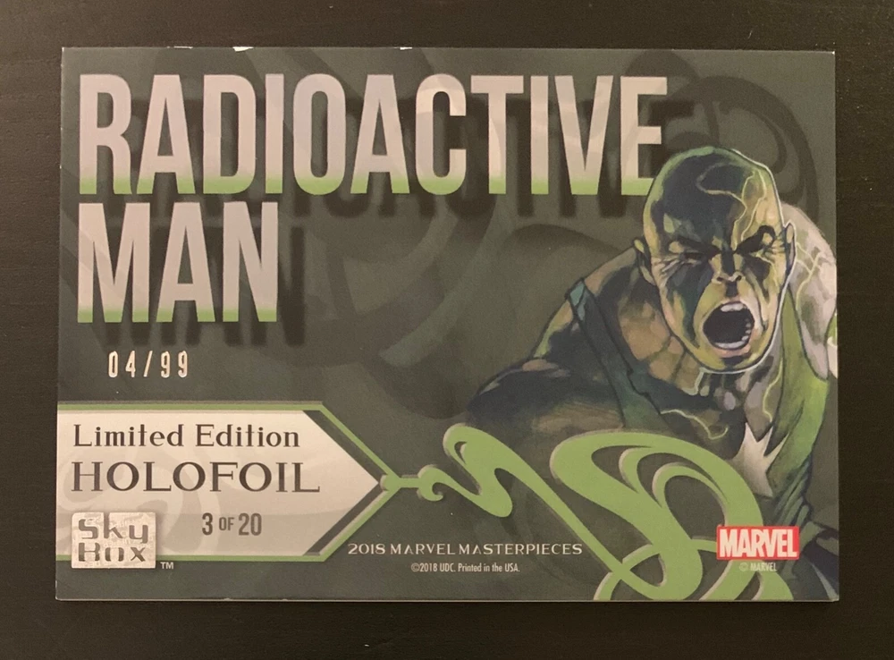2018 MARVEL MASTERPIECES # 3 RADIOACTIVE MAN /99 SPECKLE HOLOFOIL INSERT CARD. BOX HIT FOIL CARD IS IN NEAR MINT CONDITION OR BETTER. ALL MY ITEMS COME FROM A SMOKE-FREE HOUSE. SHIPMENT WILL BE SENT IN 2 DAYS OF PAYMENT. I WILL SHIP THIS CARD IN THE GREATEST OF CARE. BUYERS OUTSIDE OF THE CONTINENTAL U.S. MAY HAVE TO PAY EXTRA FOR SHIPPING. I DO OFFER COMBINE SHIPPING RATES. SO PLEASE CHECK OUT MY OTHER ITEMS . FEEL FREE TO MESSAGE ME WITH ANY QUESTIONS. THANKS FOR LOOKING AND GOOD LUCK.
