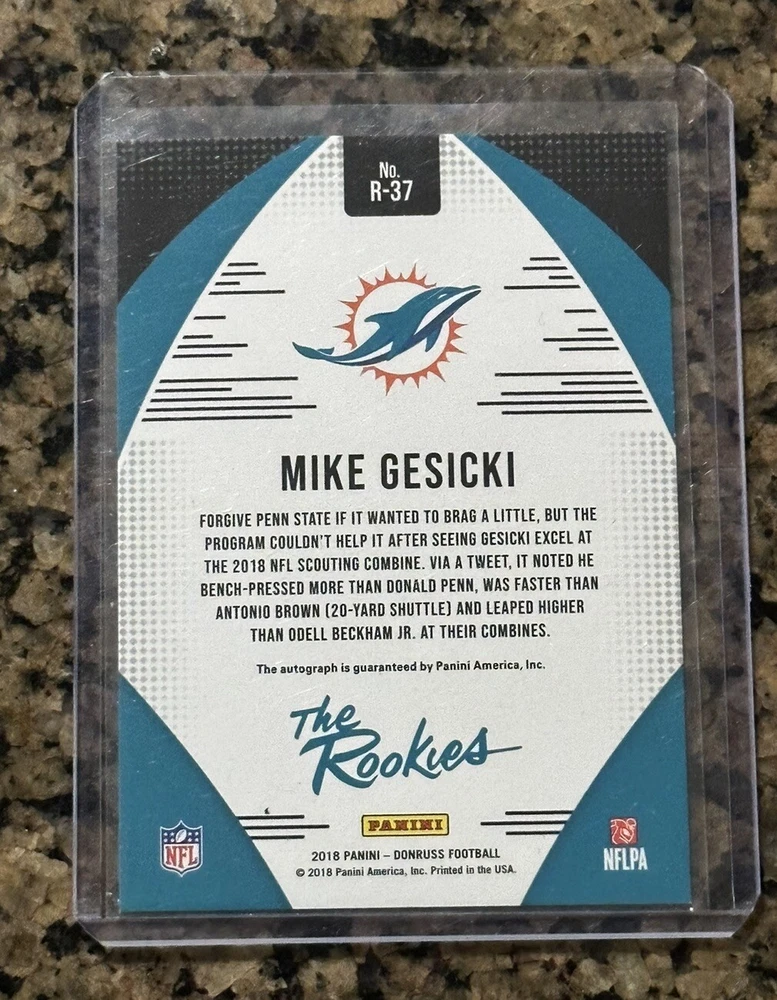 This 2018 Panini Donruss Football card features Mike Gesicki, a rookie player from the Bengles. The card is made of card stock material and has a standard size. It is autographed with a label or sticker format and is signed by the player himself. The card is part of the National Football League (NFL) league and is numbered /499. It is a great addition to any football trading card collection. The card features the player's autograph and is manufactured in the United States by Panini. This item is perfect for any football fan or collector looking for a unique and rare item to add to their collection.