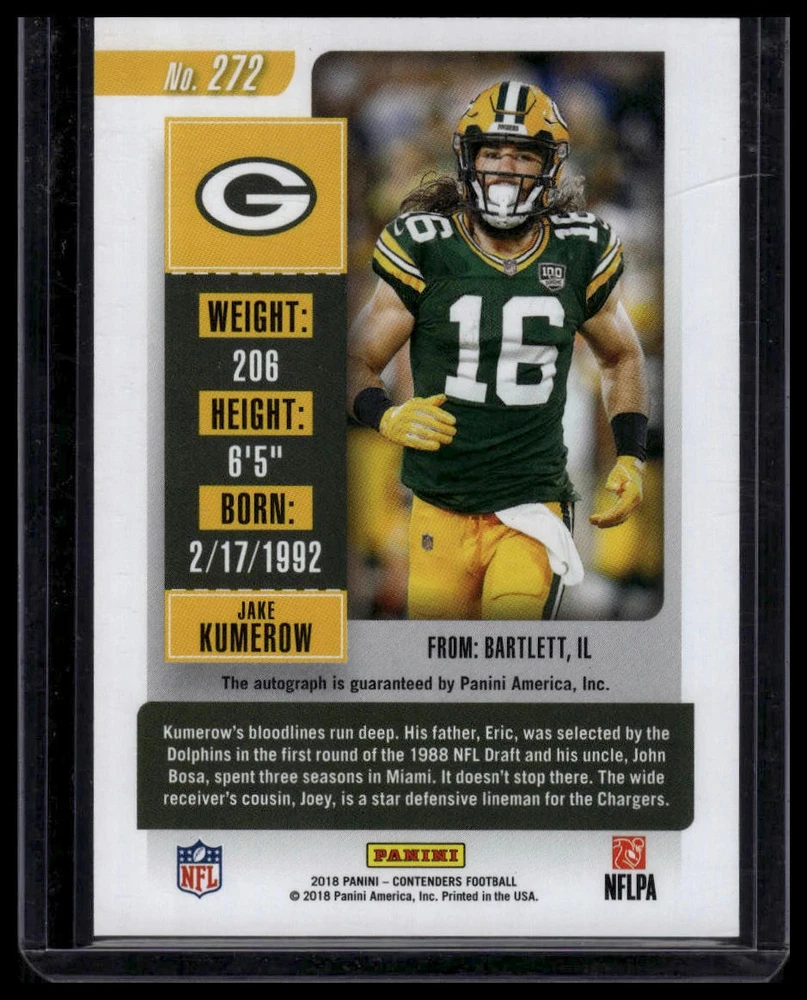 This is a nice example of a 2018 Panini Contenders #272 Jake Kumerow .Other important information about this card: RC,AUIn 2018 Jake Kumerow played for the Green Bay Packers.Please check out our other listings for more great cards. Shipping can be combined! First card is $1.25 - each additional card is $0.50. Up to 2 cards will be toploaded, additional cards won/paid for will be in a penny sleeve. Thank you for your business!