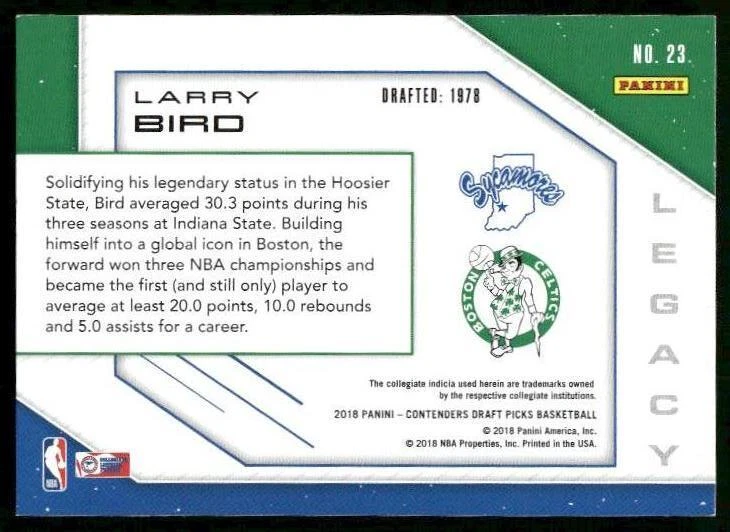 2018 BASKETBALL 2018 Panini Contenders Draft Picks #23 Larry Bird Legacy. Other important information about this card: In 2018 Larry Bird played for the . Please check out our other listings for more great cards.
