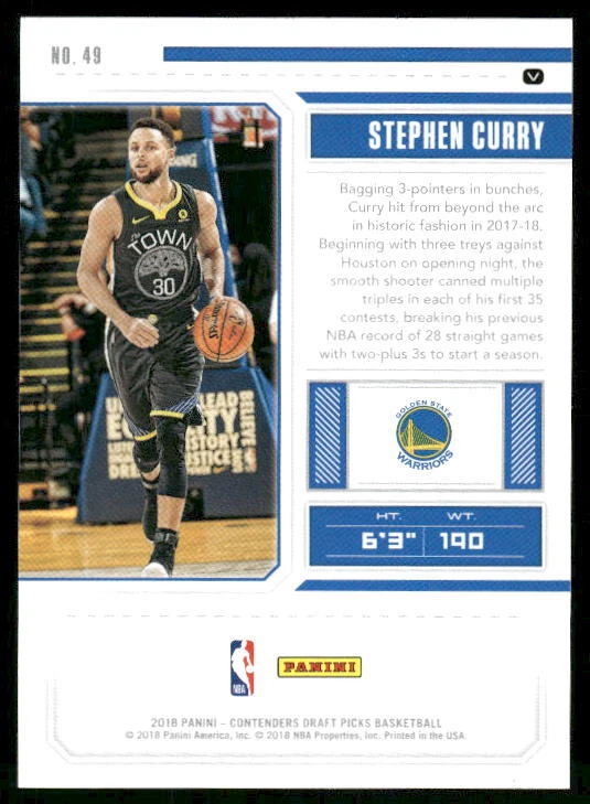 2018 BASKETBALL 2018 Panini Contenders Draft Picks #49b Stephen Curry . Other important information about this card: Bold V on back Blk Jersey In 2018 Stephen Curry played for the Golden State Warriors. Please check out our other listings for more great cards.