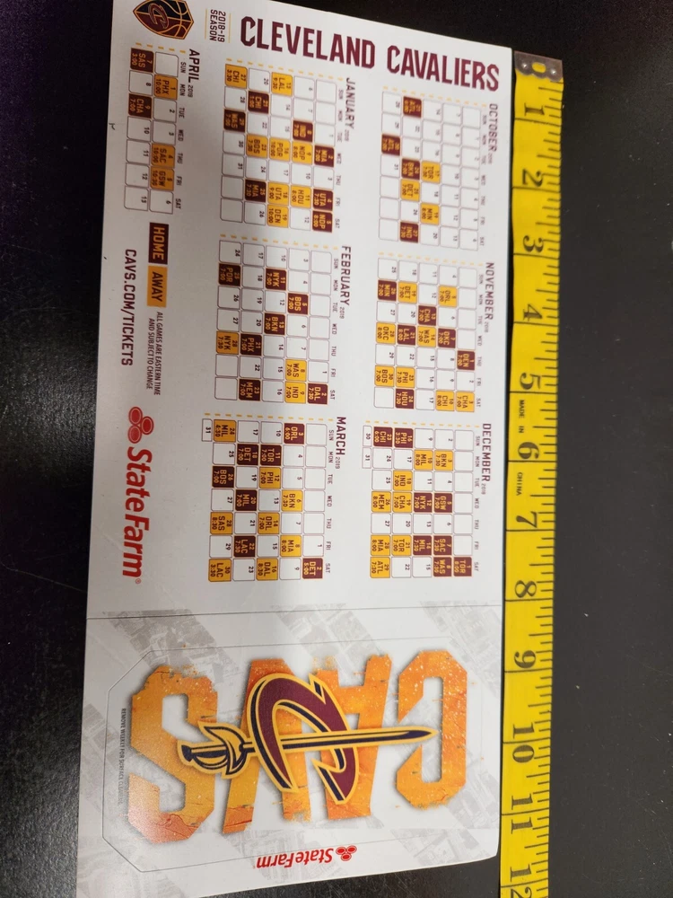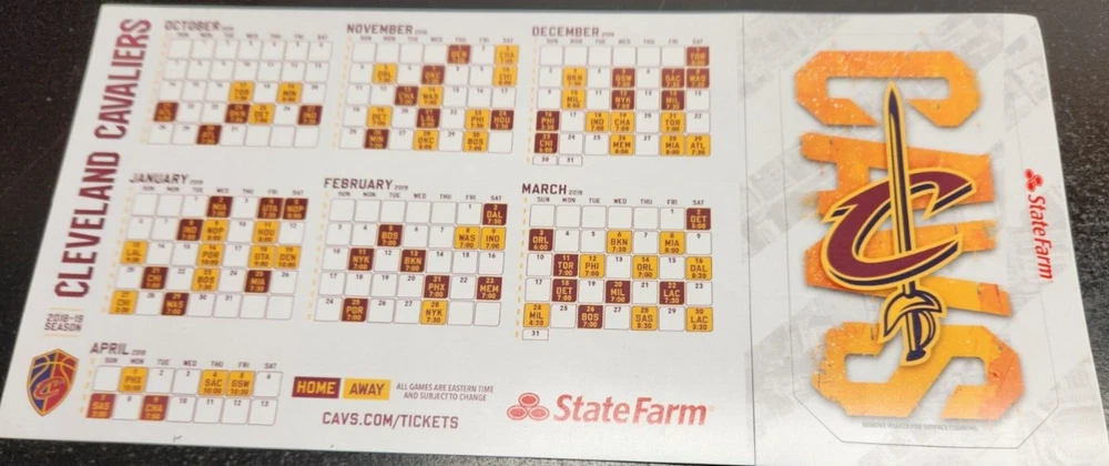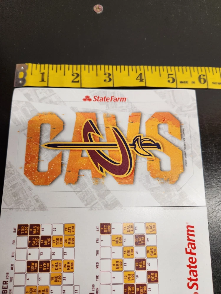 2018-19 NBA Cleveland Cavaliers Magnetic Schedule -State Farm Sponsor-5.5" x 11" This is a sports collectable. Condition is very good but I have tried to photograph any imperfections. All items are packed safely and sent via US Mail. Paper items are sent in a stiff mailer. Be sure and check out other sports items for sale. I have something from about every team and every sport. Check for new items being posted all the time.