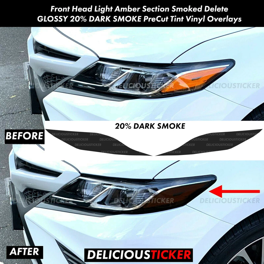 DELICIOUS TICKER PREMIUM QUALITY Shop with confidence as all our products are test fitted with our test vehicles - Deliciousticker Certified Overlays MADE IN U . S . A This listing is for ( Head light Amber CORNER Reflector Section 20% DARK SMOKE ) PRE-CUT OVERLAY TINT FILM Fits 2018+ Toyota Camry Years 2018 2019 2020 2021 2022 2023 2024 **This Overlay Tint Vinyl Film is applied on top of your oem headlights** We advise checking all pictures, including our customer's pictures on our listing. This particular overlay covers an extended amount from the amber section to cover the amber side marker as much as possible. This overlay PRE-CUT film is a designed to bond to your lights with optically clear non-permanent adhesive giving your vehicle an aggressive look while not significantly changing the output color of your lights. These high quality kits are designed to ensure protection from stones and give a factory installed appearance that will last up to 7 years. *Our Pre-cut overlay products are tested by real clients to assure for quality and realistic fitment measurements.* *CHECK OUT MORE OF OUR CAMRY OVERLAYS https://www.ebay.com/str/deliciousticker/Camry/_i.html?store_cat=3749772919 Items in the package : 1 COMPLETE SET (1: DRIVER SIDE, 1: PASSENGER SIDE) Headlight Amber CORNER Reflector Section PRE-CUT (20% SMOKE) Installation Guide Paper INSTALLATION Difficulty Level: Moderate Professional Tint Applier is Advised Slight Trimming/Tucking Depending on Customer's Preference** Wet Application Recommended/Required DUE TO FALL/WINTER SEASON , IT IS HIGHLY RECOMMENDED TO APPLY IN NEUTRAL/WARM (70F DEGREES +) ENVIRONMENT QUESTIONS Please look at the listing pictures to see the design of the overlay If you have any questions or concerns on the overlay, please message us before purchase. Message respond time 24-48hr business days For any issues with your received order, please provide picture in the message for better assistance. SHIPPING & HANDLING SHIP TO ONLY 50 STATES OF AMERICA 1-2 Business Day Handling Time USPS Shipping with Tracking Number SEE OTHER ITEMS FOR SALE: https://www.ebay.com/sch/delicioustickerca/m.html?_trksid=p3692 RETURNS Returns must be in same new condition and not installed for refund. Refund will NOT be issued for failure of following direction when installing. **Vehicles with installed tint overlay covers may not be street legal. Please check and verify with your state law before applying onto the lens**