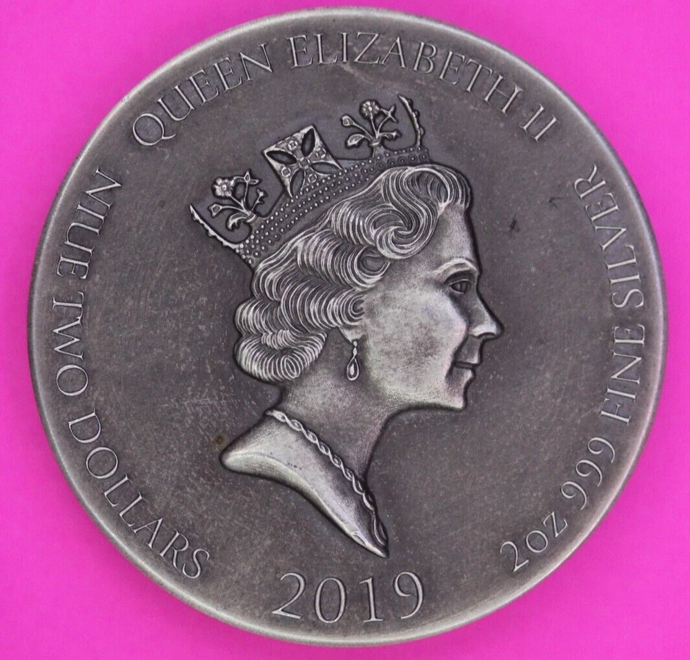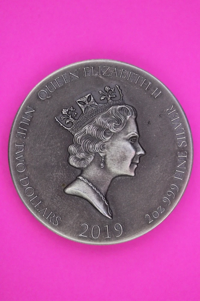 Coin: Niue Strike Type: Antique Brand/Mint: New Zealand Mint Composition: Silver Grade: Ungraded Year: 2019 Certification: Uncertified Precious Metal Content per Unit: 2 oz Country/Region of Manufacture: Niue