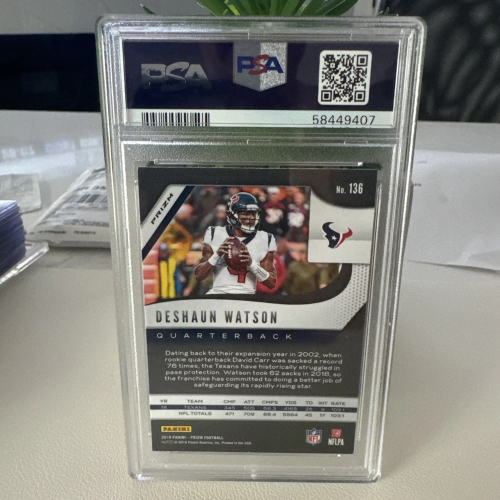 2019 PANINI PRIZM DESHAUN WATSON DISCO PRIZM #136 PSA 10 trading card featuring the talented football player in a vibrant Disco Prizm parallel. This Sports Trading Card from the 2019 Panini Prizm set is a must-have for any fan or collector looking to add a high-grade, sought-after card to their collection. Be sure to grab this rare gem showcasing Deshaun Watson in pristine condition.