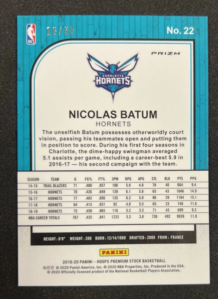 Product: Single-Parallel League: National Basketball Association (NBA) Card Attributes: SerialNumbered Parallel/Variety: Purple Flash Prizm Original/Reprint: Original Card Name: Nicolas Batum Card Manufacturer: Panini America, Inc. Player: Nicolas Batum Year: 2019-20 Franchise: N/A Set: 2019-20 Panini NBA Hoops Premium Stock - [Base] - Purple Flash Pr Card Number: 22 Sport: Basketball Athlete: Nicolas Batum Player/Athlete: Nicolas Batum Year Manufactured: 2019 Season: 2019-20 Team: Charlotte Hornets Type: Sports Trading Card Manufacturer: Panini America, Inc.