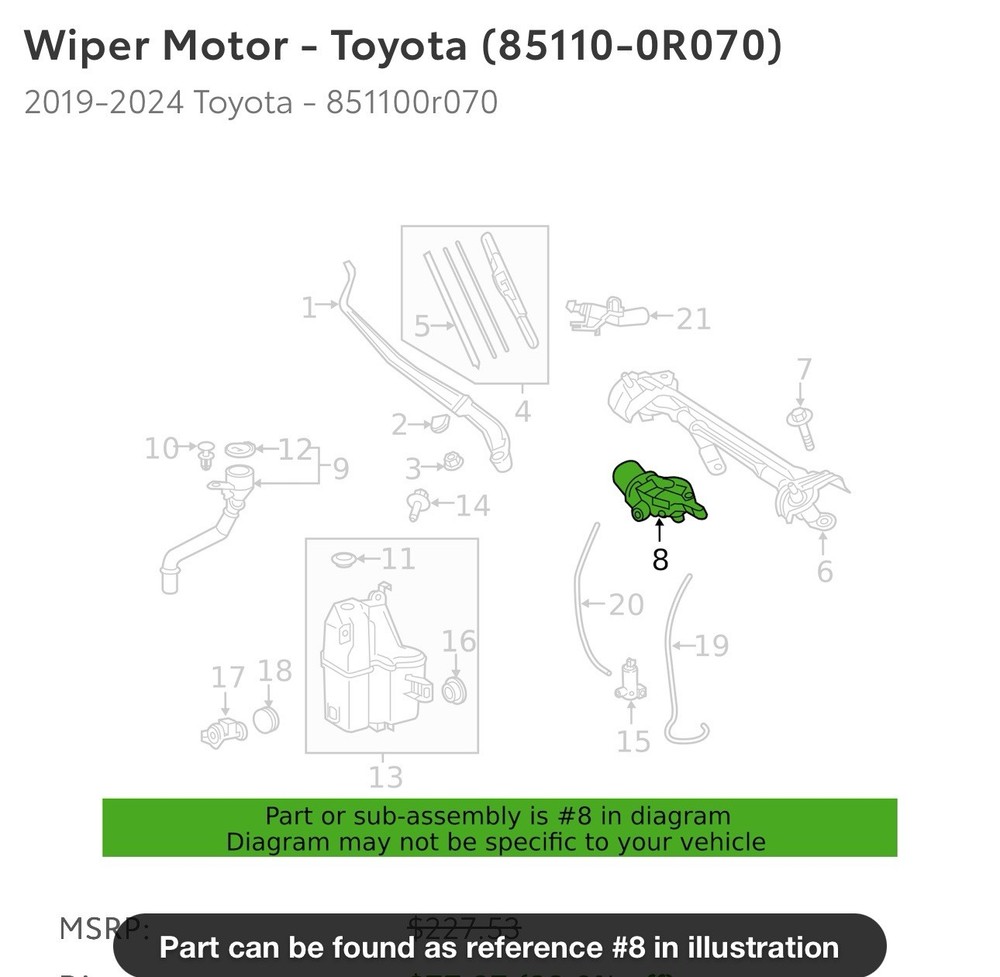 Manufacturer: Toyota Part Number: 85110-0R070 VEHICLE FITMENT Year Make Model Body & Trim Engine & Transmission 2024 Toyota RAV4 Adventure, Hybrid LE, Hybrid Limited, Hybrid SE, Hybrid Woodland Edition, Hybrid XLE, Hybrid XLE Premium, Hybrid XSE, LE, Limited, TRD Off-Road, XLE, XLE Premium 2.5L L4 - Electric/Gas, 2.5L L4 - Gas 2024 Toyota RAV4 Prime SE, XSE 2.5L L4 - Electric/Gas 2023 Toyota RAV4 Adventure, Hybrid LE, Hybrid Limited, Hybrid SE, Hybrid Woodland Edition, Hybrid XLE, Hybrid XLE Premium, Hybrid XSE, LE, Limited, TRD Off-Road, XLE, XLE Premium 2.5L L4 - Electric/Gas, 2.5L L4 - Gas 2023 Toyota RAV4 Prime SE, XSE 2.5L L4 - Electric/Gas 2022 Toyota RAV4 Adventure, Hybrid LE, Hybrid Limited, Hybrid SE, Hybrid XLE, Hybrid XLE Premium, Hybrid XSE, LE, Limited, TRD Off-Road, XLE, XLE Premium 2.5L L4 - Electric/Gas, 2.5L L4 - Gas 2022 Toyota RAV4 Prime SE, XSE 2.5L L4 - Electric/Gas 2021 Toyota RAV4 Adventure, Hybrid LE, Hybrid Limited, Hybrid XLE, Hybrid XLE Premium, Hybrid XSE, LE, Limited, TRD Off-Road, XLE, XLE Premium 2.5L L4 - Electric/Gas, 2.5L L4 - Gas 2021 Toyota RAV4 Prime SE, XSE 2.5L L4 - Electric/Gas 2020 Toyota RAV4 Adventure, Hybrid LE, Hybrid Limited, Hybrid XLE, Hybrid XSE, LE, Limited, TRD Off-Road, XLE, XLE Premium 2.5L L4 - Electric/Gas, 2.5L L4 - Gas 2019 Toyota RAV4 Adventure, Hybrid LE, Hybrid Limited, Hybrid XLE, Hybrid XSE, LE, Limited, XLE, XLE