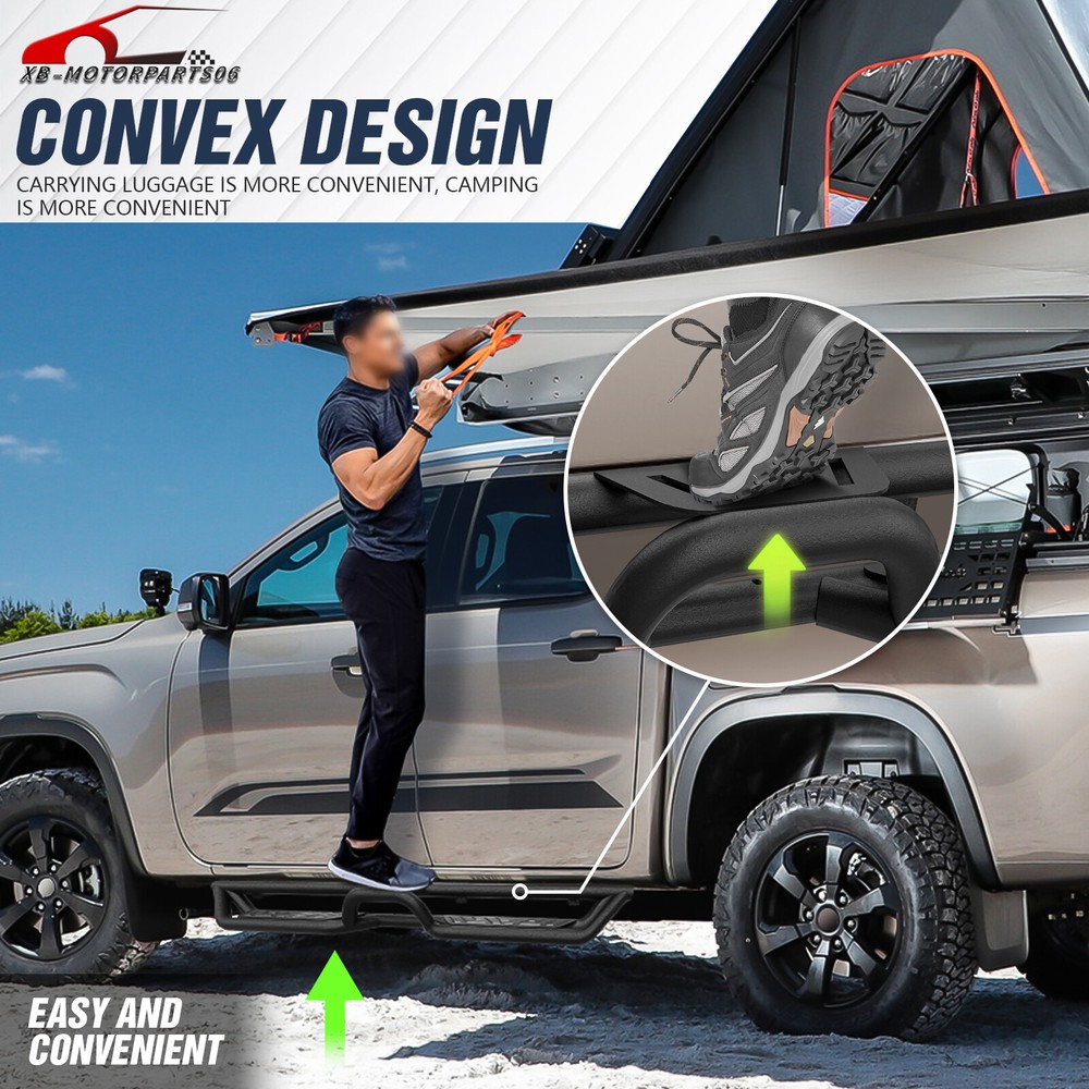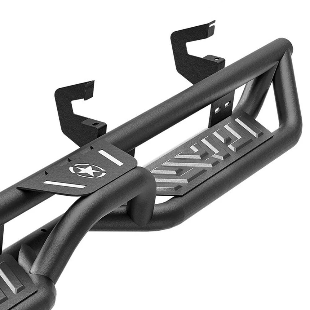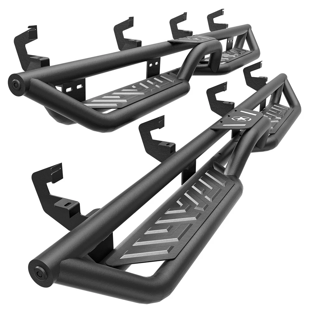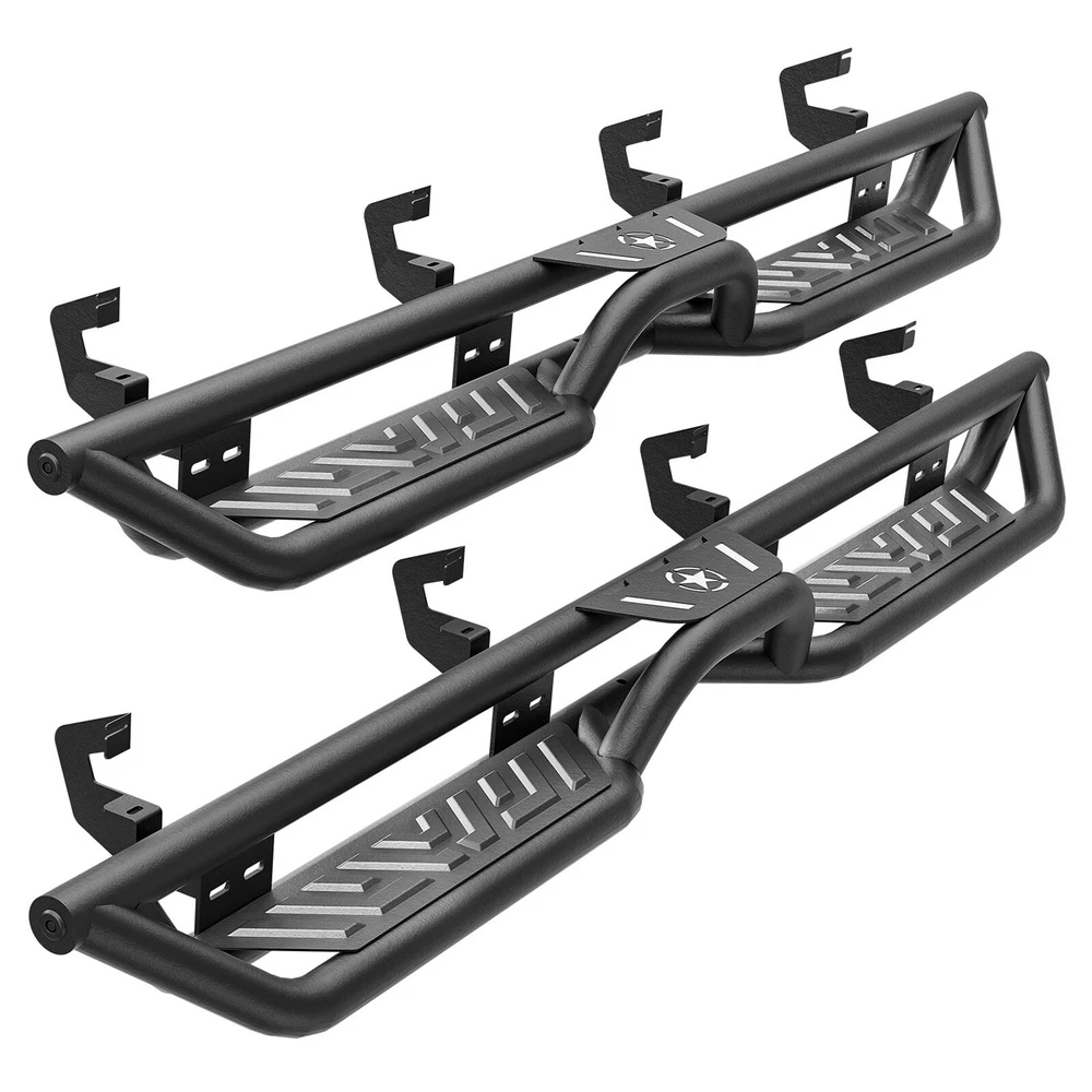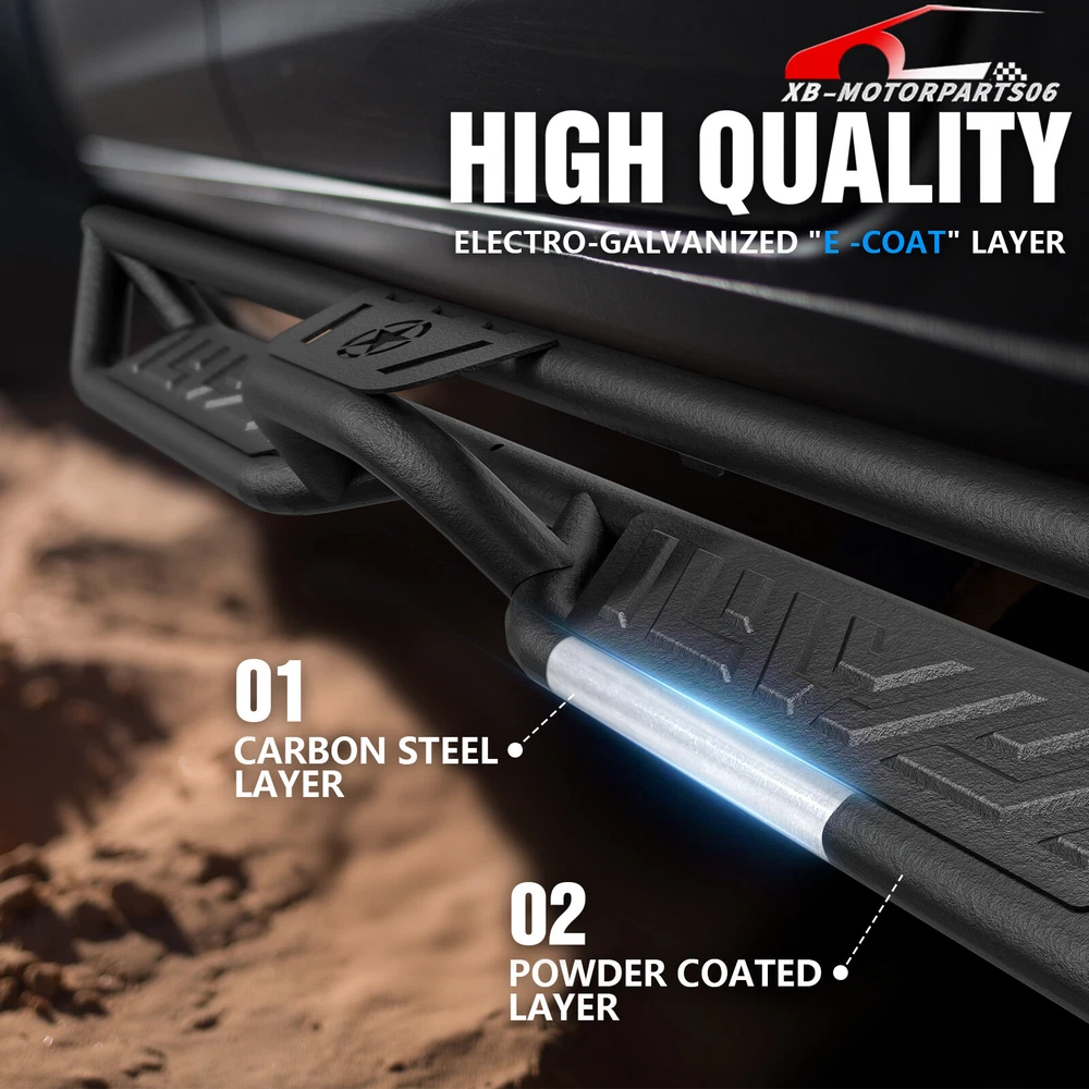 Side Steps Running Boards For 2019-2025 Chevy Silverado&GMC Sierra 1500 Crew Cab Suitable Models : Compatible with 2019-2025 Chevy Silverado & GMC Sierra 1500, 2020-2025 Chevrolet Silverado & Sierra 2500 3500 HD Crew Cab ( Not For 2019 1500 Limited ) ( 4 Full-Size Doors ) Package Includes : 2 side bars, a set of brackets, installation instructions, and all necessary hardware Product Information : Product Dimensions: 83 x 6 x 6 inches Installation mode: Bolt-On Weight Limit: 550LBS Placement on Vehicle: Left and Right Item Weight: 70.4 pounds Material: Carbon Steel Color: Black (hand measurements may have an error of 2-3 mm/0.078-0.118 in) Feature: ① The side steps feature a dual-layer design, enhancing convenience for vehicles with lift kits and oversized tires, while also making roof access easier; ② The extra-thick main tube provides superior load-bearing capacity, preventing deformation and enhancing vehicle protection; ③ The stepping area is designed with a high-end textured pattern, ensuring secure and stable footing to prevent slipping; ④ The high-quality black powder coating provides outstanding rust and corrosion resistance. Constructed from heavy-duty 2mm carbon steel, each side can withstand a weight of 550 pounds; ⑤ Simple bolt-on installation without the need for drilling or cutting; Warranty Period : 2 year Standard Shipping (FedEx Ground or FedEx Home Delivery) Will usually ship within 3 business days of receiving cleared payment Suitable Models : Compatible with 2019-2025 Chevy Silverado & GMC Sierra 1500, 2020-2025 Chevrolet Silverado & Sierra 2500 3500 HD Crew Cab ( Not For 2019 1500 Limited ) ( 4 Full-Size Doors ) Package Includes : 2 side bars, a set of brackets, installation instructions, and all necessary hardware Product Information : Product Dimensions: 83 x 6 x 6 inches Installation mode: Bolt-On Weight Limit: 550LBS Placement on Vehicle: Left and Right Item Weight: 70.4 pounds Material: Carbon Steel Color: Black (hand measurements may have an error of 2-3 mm/0.078-0.118 in) Feature: ① The side steps feature a dual-layer design, enhancing convenience for vehicles with lift kits and oversized tires, while also making roof access easier; ② The extra-thick main tube provides superior load-bearing capacity, preventing deformation and enhancing vehicle protection; ③ The stepping area is designed with a high-end textured pattern, ensuring secure and stable footing to prevent slipping; ④ The high-quality black powder coating provides outstanding rust and corrosion resistance. Constructed from heavy-duty 2mm carbon steel, each side can withstand a weight of 550 pounds; ⑤ Simple bolt-on installation without the need for drilling or cutting; Warranty Period : 2 year