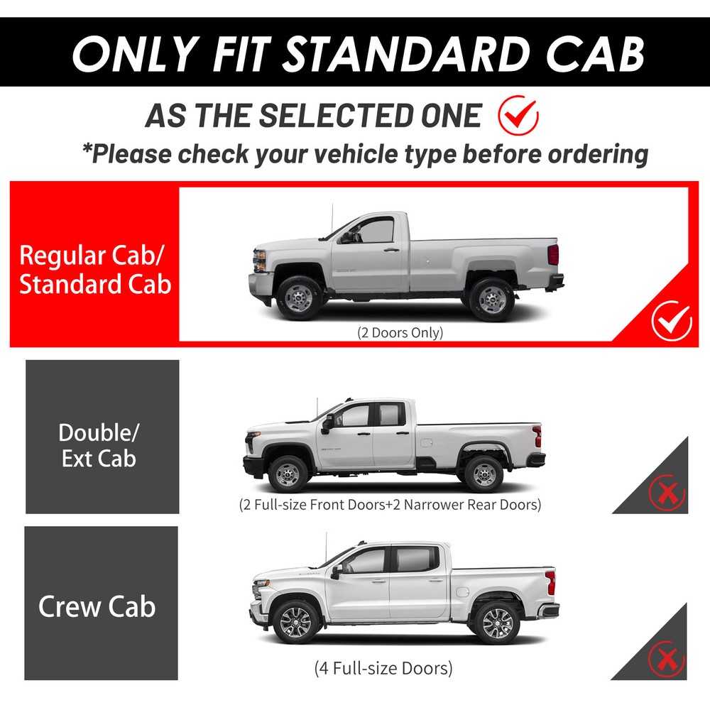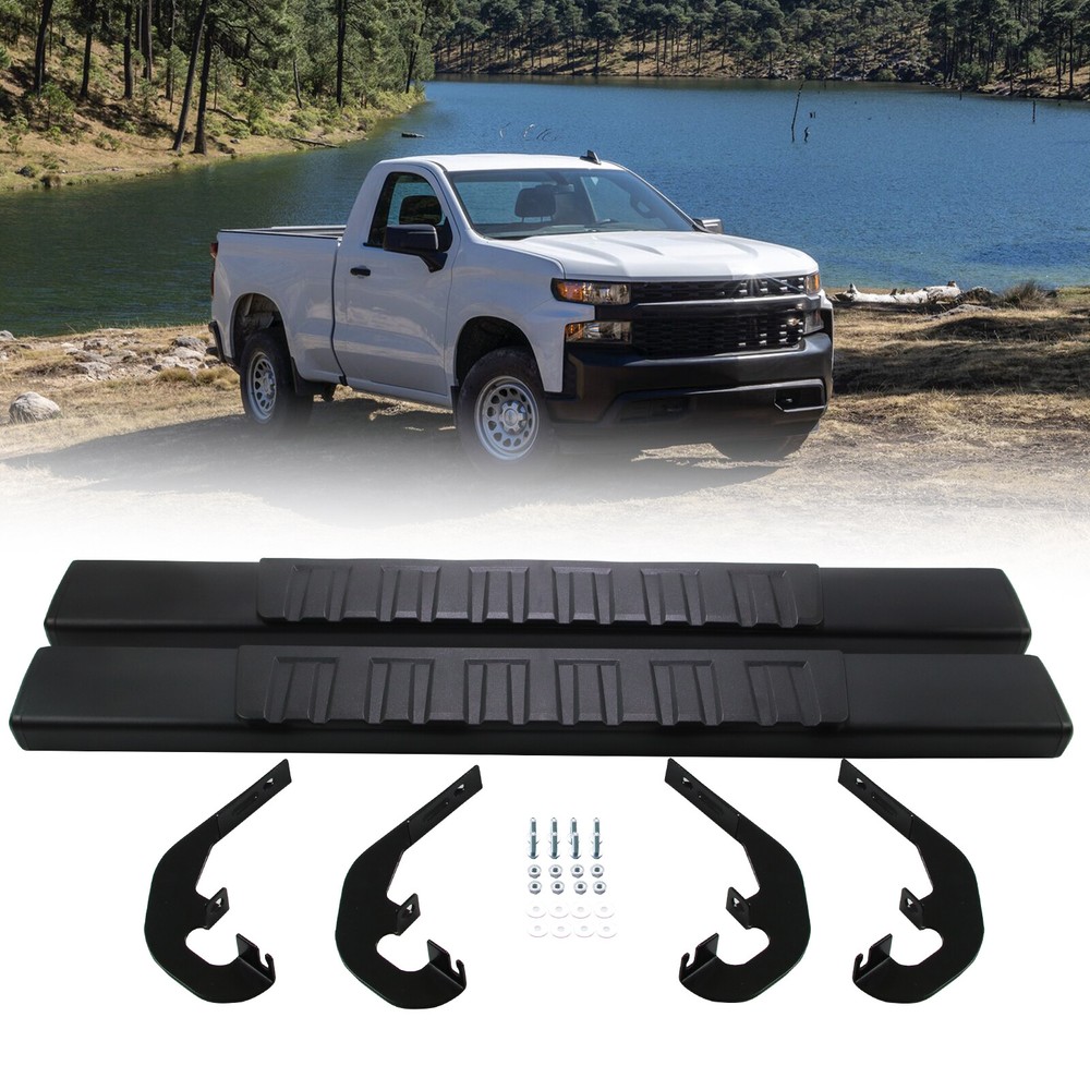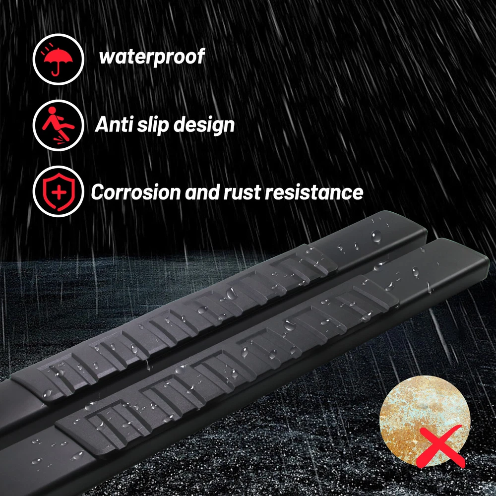 Fitment: 2019 - 2025 Chevrolet Silverado 1500 2020 - 2025 Chevrolet Silverado 2500HD/3500HD 2019 - 2025 GMC Sierra 1500 2020 - 2025 GMC Sierra 2500HD/3500HD Package Include: 1x Pair of Running Boards (Left + Right) Brackets on Each Side Mounting Hardware Features & Benefits : 1.High-Quality Material: These running boards are made from a blend of durable, heavy-duty stainless steel and ABS plastic. The seamless ABS plastic tread is joined with a powder-coated body surface to resist UV rays, rust, and slippage. They are also composed of the finest aluminum alloy, ensuring sturdiness, durability, and resistance to wear and rust. 2.Protective and Convenient: These running boards protect the car's paint from scratches and allow easy access to the top of the car for tasks such as reaching the luggage rack or cleaning the rooftop. The slider design allows forward and backward adjustment for better customization and a clean interior due to the closed-end design. 3.Stylish Finish: Regardless of the finish you choose, these running boards provide a smooth, finished look that perfectly complements your factory chrome and trim. 4.Safety and Comfort: The running boards and side steps provide a safe and simple way to transport coworkers, pets, or children. The anti-slip tread surface and rugged construction ensure a solid underfoot feeling. 5.Easy Installation: These running boards offer an easy bolt-on installation with no cutting or drilling required. Made of high-quality ABS plastic and steel, they can support up to 500 lbs. Both driver and passenger side steps are included, with all brackets and mounting hardware provided. The installation guide combines graphics and text for a detailed walkthrough.