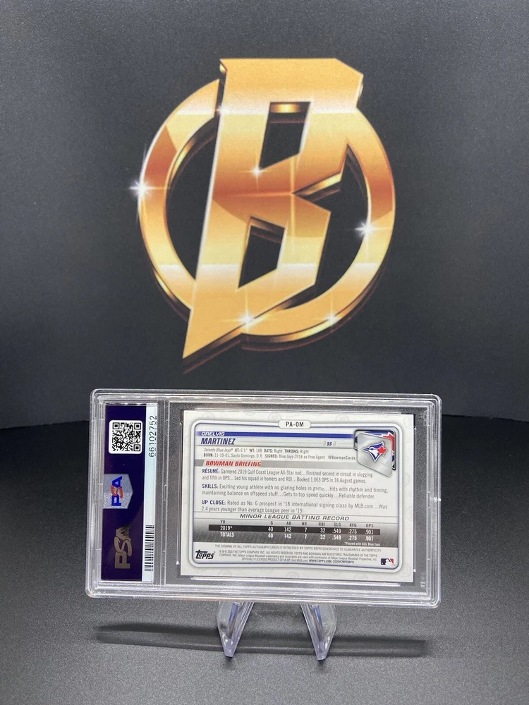 Up for sale is a 2020 Bowman Prospects Autograph trading card featuring rising baseball star Orelvis Martinez of the Toronto Blue Jays. This single-insert card is part of the exclusive 2020 Bowman set and has been professionally graded by the respected Professional Sports Authenticator (PSA) with a grade of 10, ensuring its authenticity and quality. This rare and valuable card bears Martinez's autograph and Rookie designation, making it a must-have for any serious collector. Whether you're an avid sports fan or a seasoned trading card enthusiast, this item is sure to be a prized addition to your collection. Don't miss out on the chance to own this authentic and highly coveted piece of sports memorabilia.