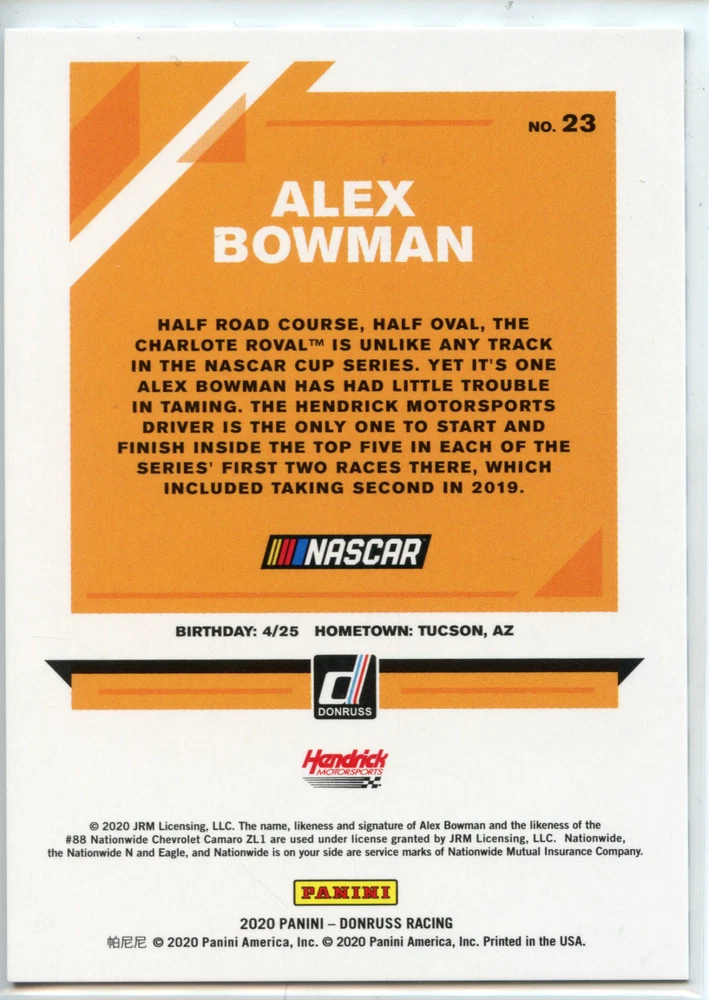 Card Size: Standard Racing Type: NASCAR Year: 2020 Sport: Auto Racing Card Manufacturer: Panini Original/Reprint: Original Manufacturer: Donruss Graded: No Set: 2020 Donruss Racing Season: 2020 Brand: Panini Type: Sports Trading Card Series: Donruss Features: Parallel/Variety, Serial Numbered Team: N/A Card Number: 23 Year Manufactured: 2020 Parallel/Variety: Black Numbers Autographed: No League: NASCAR Player/Athlete: Alex Bowman