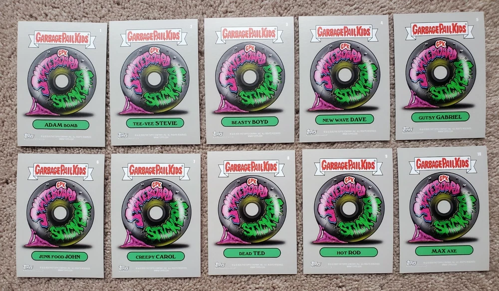 2020 Garbage Pail Kids Skateboard Stickers 10 Sticker Set...RARE...Limited to 1,025 Complete Sets THIS IS SO COOL. IF YOU ARE GARBAGE PAIL KIDS COLLECTOR, THIS CLASSIC SET IS SOMETHING THAT YOU SHOULD HAVE TUCKED AWAY IN YOUR COLLECTION. IT'S AN INSTANT CLASSIC. This auction is for the entire 10 Sticker set... 1 Adam Bomb 2 Tee-Vee Stevie 3 Beasty Boyd 4 New Wave Dave 5 Gutsy Gabriel 6 Junk Food John 7 Creepy Carol 8 Dead Ted 9 Not Rod 10 Max Axe LIMITED to 1,025 complete sets. You get the entire 10 sticker set. Be sure to check out our other auctions. Thanks for bidding and enjoy! All winning bidders must pay thru Paypal. I apologize for the BS that the pay thru Paypal only has caused to our good customers. Payment must be received ten days from the end of the auction. To all winning bidders, positive feedback will be given shortly after receiving payment. Thanks!! On June-11-25 at 11:46:16 PST, seller added the following information: