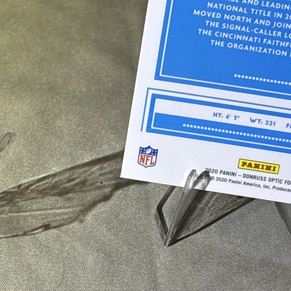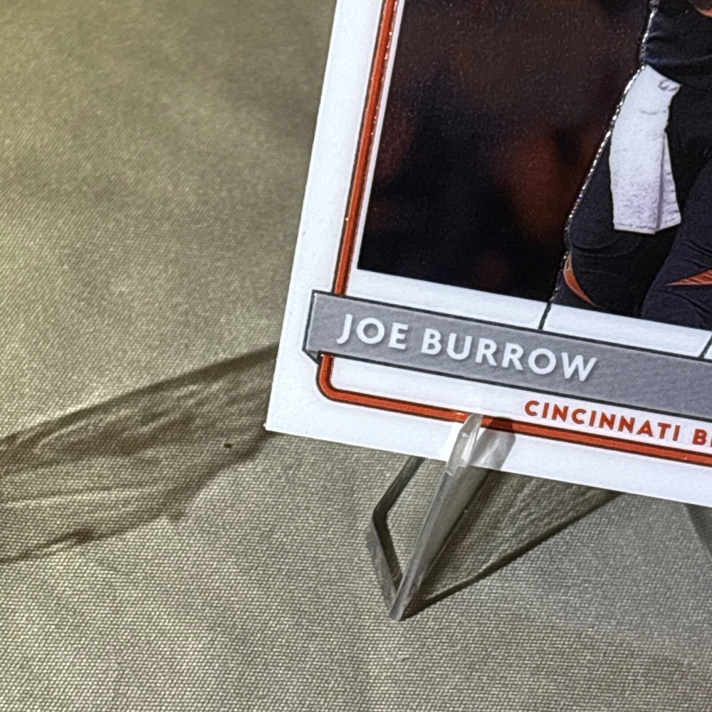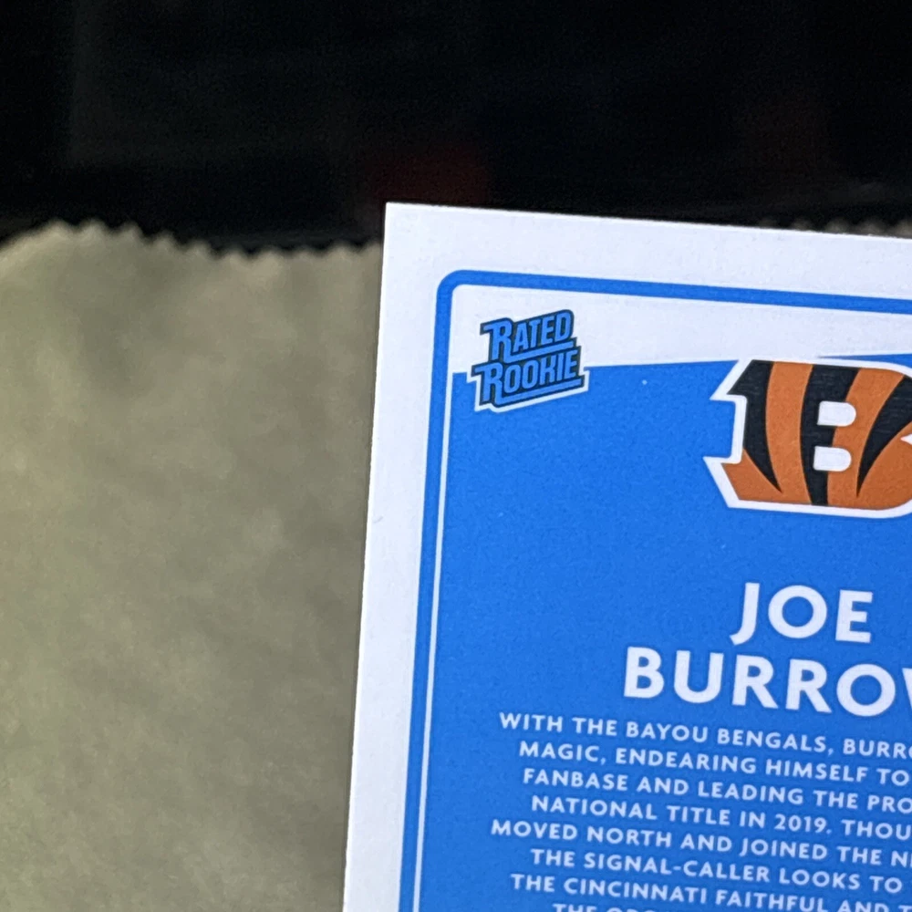 I’m not a grader, so my opinion is pretty clean, a mint +! I am human and only use light and angles, so I always have satisfaction guaranteed for my buyers! Want you to be satisfied with your purchase and service! I’m not perfect and am accountable if I miss something! Thank you so much for your support!🙏 The product is a 2020 Panini Donruss Optic-Rated Rookies Optic #151 Joe Burrow (RC) trading card. It is described as "Pretty Clean" and is in near mint or better condition.