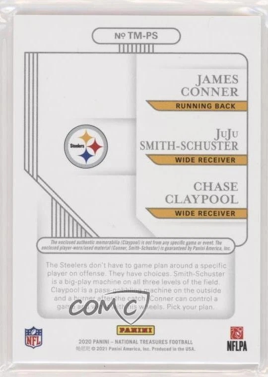 Original/Reprint: Original Parallel/Variety: [None] Athlete: Chase Claypool Year: 2020 Professional Grader: None Team: Pittsburgh Steelers Card Name: Chase Claypool, James Conner, JuJu Smith-Schuster Graded: No Card Attributes: Memorabilia, Rookie, SerialNumbered Card Number: TM-PS Product: Single-Insert Year Manufactured: 2020 Season: 2020 Franchise: N/A Sport: Football Player/Athlete: Chase Claypool Set: 2020 Panini National Treasures - NFL Gear Trio Materials Grade: Ungraded Manufacturer: Panini America, Inc. Card Manufacturer: Panini America, Inc. Player: Chase Claypool Type: Sports Trading Card